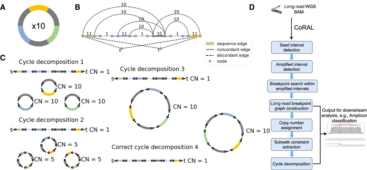 Long-read-based ecDNA reconstruction. (A) Native ecDNA structure and copy number. (B) Cartoon of the breakpoint graph derived from the ecDNA in A. Sequence edges represent segments of the reference genome. Concordant edges connect consecutive sequences with respect to the reference genome order, and discordant edges connect nonconsecutive genome segments. Nodes are created at the endpoints of each sequence edge and include source and sink nodes, s and t. (C) Multiple collections of decomposed paths and cycles from the breakpoint graph explain the changes in copy number and observed SVs. Long reads that span regions of high multiplicity can help resolve the correct cycle. (D) Overview of the CoRAL method.