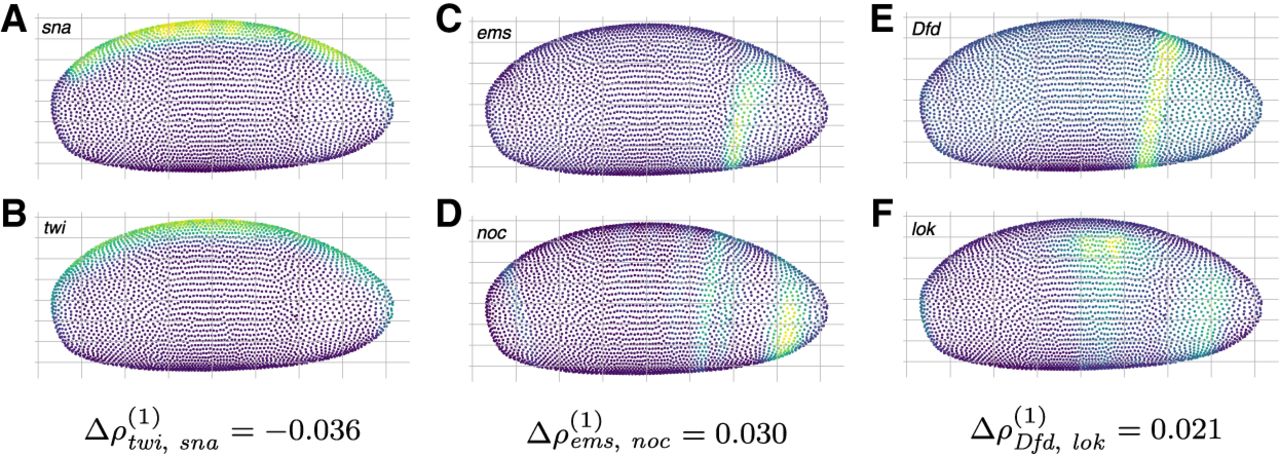 Visualization of genes with strong spatial associations in the Drosophila blastoderm as identified by SpaCeNet. Figures show gene expression levels of the top ranked gene pairs as identified by SpaCeNet with sna and twi in A and B, ems and noc in C and D, and Dfd and lok in E and F, respectively. The genes sna and twi (A,B) are expressed in the same areas in concordance with Δρtwi, sna = −0.036 as inferred by SpaCeNet. Genes ems and noc (C,D) are expressed in adjacent but different areas, which is consistent with the inferred SpaCeNet association Δρems,noc = 0.030. This also holds true for the gene pair Dfd and lok (E,F), which are also expressed in adjacent but different areas, consistent with ΔρDfd,lok = 0.021. For all illustrations, the three-dimensional spatial coordinates were projected into a two-dimensional plane using a principal component analysis.