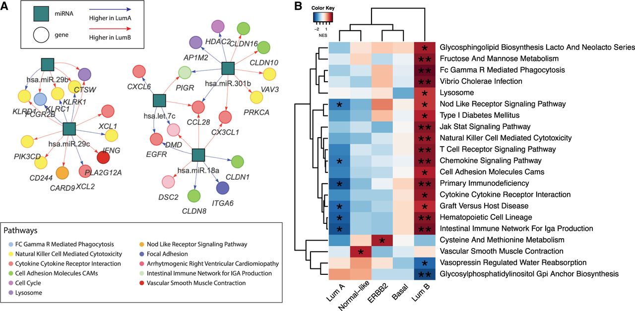 BONOBO networks reveal distinct miRNA–mRNA coexpression patterns in different breast cancer subtypes. (A) Pairs of genes and miRNAs that are most differentially coexpressed between Luminal A and Luminal B subtypes: Gene nodes are represented by colored circles, where the colors correspond to the biological pathway associated with that gene; miRNAs are represented by teal squares. Edges are colored red if they have higher weights in Luminal A compared with Luminal B and are colored blue if its miRNA-specific degree is greater in Luminal B than in Luminal A. (B) Pathways for which the mean correlation with miRNAs is significantly (at significance level 0.05) associated with survival in a Cox proportional hazard model: Heatmaps are colored by the t-statistic of the pathway score in the Cox model. Rows correspond to pathways, and columns represent the breast cancer subtypes. Pathways for which a higher correlation with miRNAs is associated with better survival are colored blue, and pathways for which a higher correlation with miRNAs is associated with worse survival are colored red.