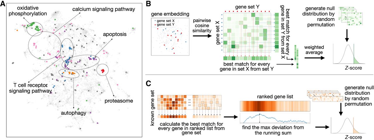 Overview of ANDES. (A) A Uniform Manifold Approximation and Projection (UMAP) plot (McInnes et al. 2018) of the node2vec gene embedding for a human protein–protein interaction network with a set of Alzheimer's disease genes (hsa05010) highlighted. Within this set of disease genes, several subclustered biological processes representing diverse biological functions are scattered across the embedding space. ANDES is capable of considering this functional diversity when matching gene sets. (B) Overview of the ANDES set similarity framework. Given two gene sets, ANDES first calculates the pairwise cosine similarity between every gene in each of the two sets. Based on the underlying similarity matrix, ANDES finds the best match for every gene (in both directions), and then calculates the weighted average (taking into account gene set size) to yield a single score. Statistical significance is estimated using a cardinality-aware null distribution. (C) Overview of the ANDES rank-based gene set enrichment method. Given a ranked gene list based on an experimental result and a known gene set, ANDES calculates the best-match similarity for every gene in the ranked list. Walking down the ranked list, ANDES finds the maximum deviation from the running sum. The final enrichment score is also estimated using a cardinality-aware null distribution.