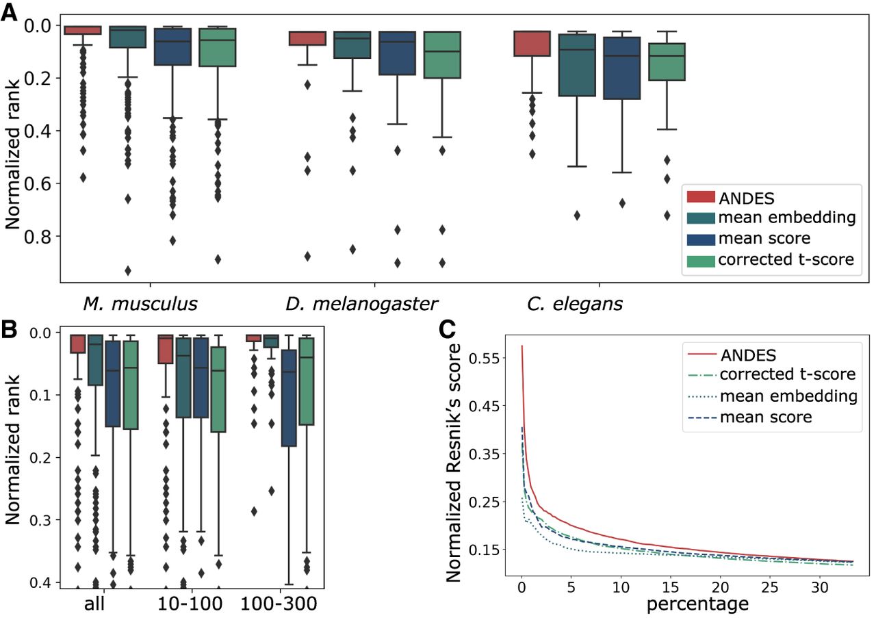 ANDES estimates gene set functional similarity across organisms better than existing methods. (A) Boxplot of the ranking of matched GO terms between human and three model organisms: M. musculus, D. melanogaster, and C. elegans, with 213, 40, and 43 shared GO slim terms, respectively. To facilitate comparison between organism pairs, the ranking is normalized by the number of shared GO terms. For each of the three organisms, ANDES consistently outperforms the mean embedding, corrected t-score, and mean score methods. (B) Boxplot of the ranking of matched GO terms for Homo sapiens and M. musculus. Gene set pairs are grouped into two categories according to the sum of the number of genes in both gene sets (small [10–100] and large [101–300]). ANDES again consistently outperforms other methods regardless of gene set size. (C) Comparison of the cumulative average of the Resnik's score walking down the ranked list for H. sapiens and M. musculus. ANDES consistently outperforms other methods until the score converges at ∼30% of all pairs.