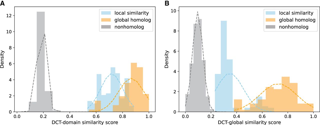 Comparison of embedding-based similarity between G6PD-containing proteins. (A) Domain-level embedding similarity computed by DCTdomain; (B) Whole-protein embedding similarity computed by DCTglobal. Domain-level embedding works better for computing the similarity between protein pairs with local similarity; the distribution of similarity scores for such pairs (shown in blue) shifts toward those for global homologs (shown in orange) when domain-level embeddings (A) instead of whole-protein embeddings (B) were used.