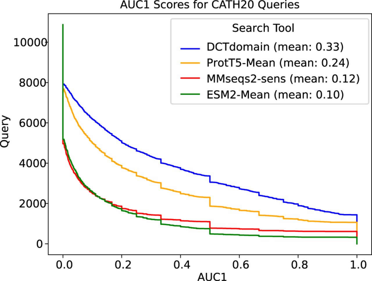 AUC1 plots for comparison of the different methods on the CATH20 database search benchmark that contains distant homologs. As reported in their paper (Schütze et al. 2022), using ProtT5 mean embeddings (i.e., knnProtT5) outperforms MMseqs2-sensitive. DCTdomain outperforms ProtT5-Mean by a similar margin, whereas using the mean embedding method with ESM-2 performs slightly worse than MMseqs2-sens (sensitive mode).