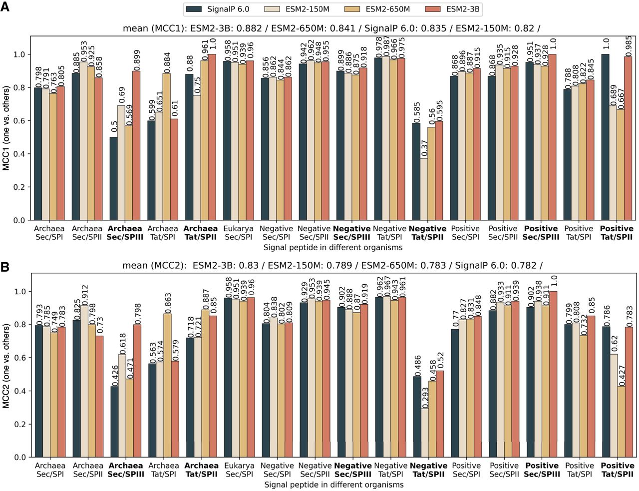 PEFT-SP using LoRA and SignalP 6.0 performance in terms of MCC score for each SP type across different organisms. The bold text in the x-axis represents the SP type with small training samples. The MCC1 and MCC2 scores are shown above the bars. The sorted mean values for MCC1 and MCC2 are listed at the top. (A) MCC1 scores performance on a negative class composed of soluble and transmembrane proteins. (B) MCC2 scores performance on a negative class comprising soluble and transmembrane proteins and other SP types.