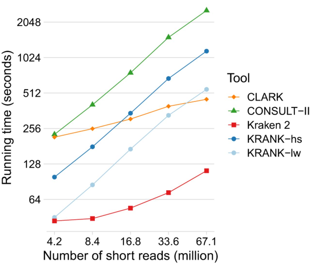 Query time for varying numbers of short reads sampled across 756 genomes from different novelty levels. Running time measurements were performed using 96 threads on a machine with 2.2 GHz AMD EPYC 7742 processors. Both axes (x and y) are in log-scale.