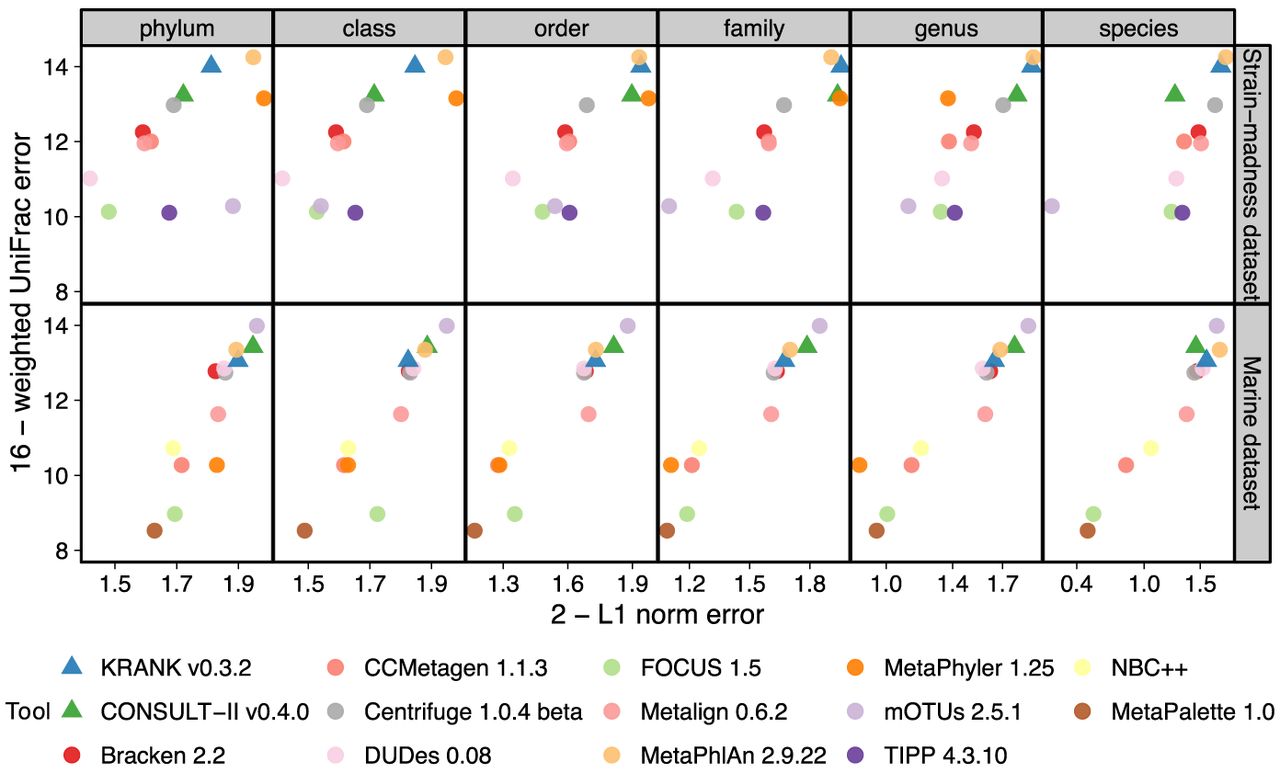 Comparing KRANK (high-sensitivity setting using 51.2 GB) with other participants in CAMI-II benchmarking challenge (Meyer et al. 2022). As in that original paper, we show the upper bound of L1 norm (2) minus actual L1 norm versus the upper bound of weighted UniFrac error (16) minus actual weighted UniFrac error. Each data point stands for the average of 100 strain-madness samples or 10 marine samples. Metrics were computed using OPAL with default settings and the -n option. The UniFrac error is the total amount of predicted abundances that needs to be moved along the edges of the taxonomic tree to make them overlap with the true abundance profile. The L1 error simply measures the accuracy of reconstructing the relative abundance profile at a fixed rank.