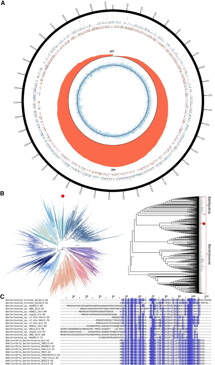 Genome assembly and annotation of Bacteriovorax sp. ICPB 3264 [H-I A3.12]. (A) Circos (Krzywinski et al. 2009) plot of the Bacteriovorax sp. ICPB 3264 [H-I A3.12] chromosome. Forward- and reverse-strand protein-coding genes are shown in red and blue, respectively, in the inner tile layer; ribosomal RNAs and tRNAs are shown in the outer tile layers. The red histogram shows the cumulative GC skew (Grigoriev 1998), with the inflection points corresponding to the replication origins and termini (Lobry 1996). The light blue histogram in the innermost circle shows the GC skew for each individual bin along the genome. (B) Place of Bdellovibrionota in the global prokaryote phlyogeny (obtained from Zhu et al. 2019 at https://biocore.github.io/wol/gallery/ranks/order.pdf) on the left and the maximum likelihood 16S rRNA tree (generated using RAxML-NG) (Kozlov et al. 2019) of members of the Bdellovibrionota phylum and the phylogenetic location of strain ICPB 3264 [H-I A3.12] on the right. Bdellovibrionota is highlighted with a red dot on the left, and the strain we worked with is highlighted with a red dot on the right. (C) Multiple sequence alignment of histone proteins identified in select Bacteriovorax and Bdellovibrio genomes. In contrast to the singlet histone folds in Bdellovibrio, the histone gene in Bacteriovorax sp. ICPB 3264 [H-I A3.12] is a histone doublet; the two histone folds are shown separately (top two rows).