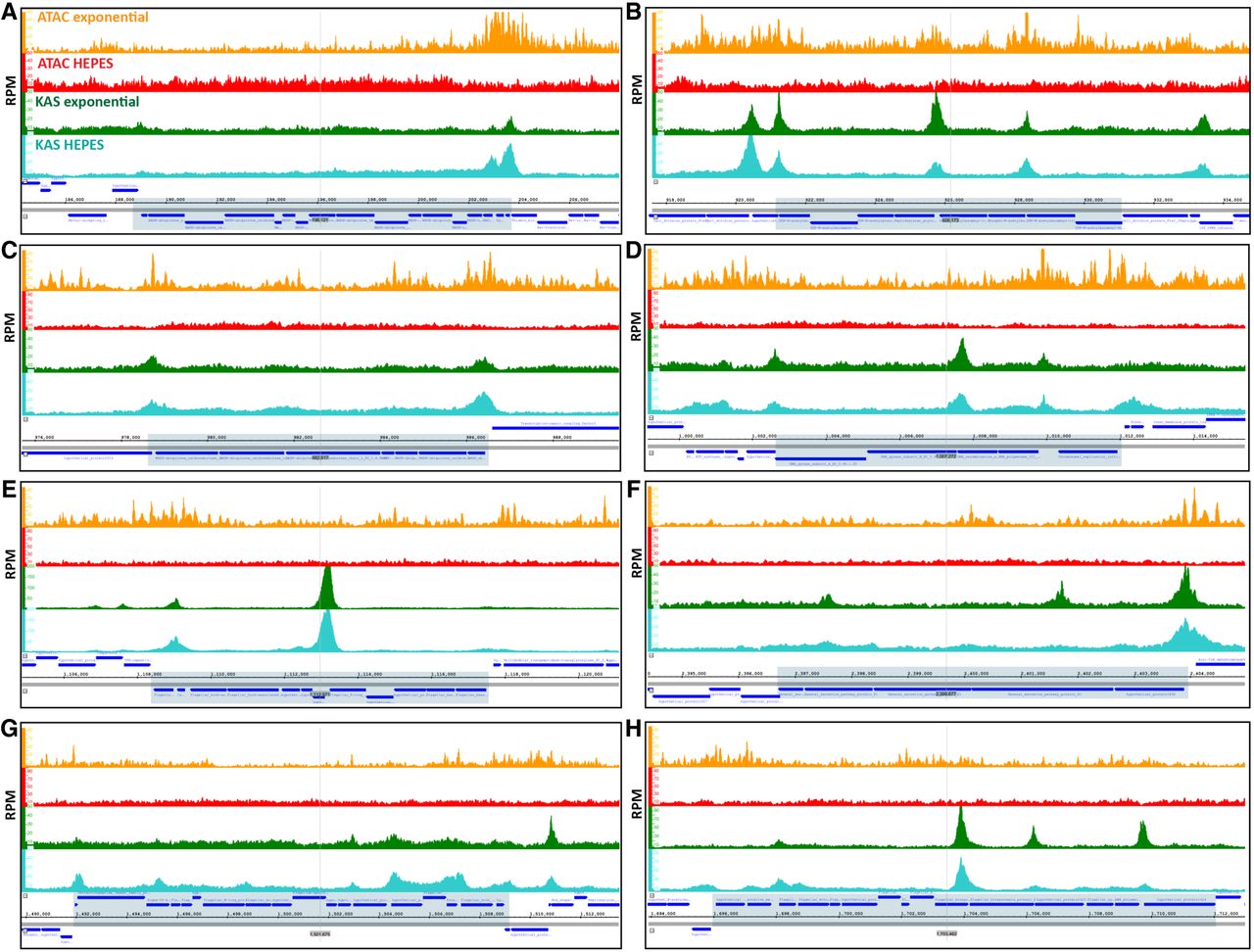 Chromatin accessibility and active transcription levels in Bacteriovorax operons. (A–H) Genome browser snapshots of ATAC-seq and KAS-seq levels in exponentially growing and starved (HEPES) cells for eight different Bacteriovorax operons. (A) NADH ubiquinone oxidoreductase, (B) UDP-N-acetylmuramic acid synthesis pathway enzymes, (C) NADH ubiquinone oxidoreductase (another operon), (D) DNA gyrase, (E) flagellum genes, (F) general secretion pathway genes, (G) flagellum genes (another operon), and (H) flagellum genes (another operon).