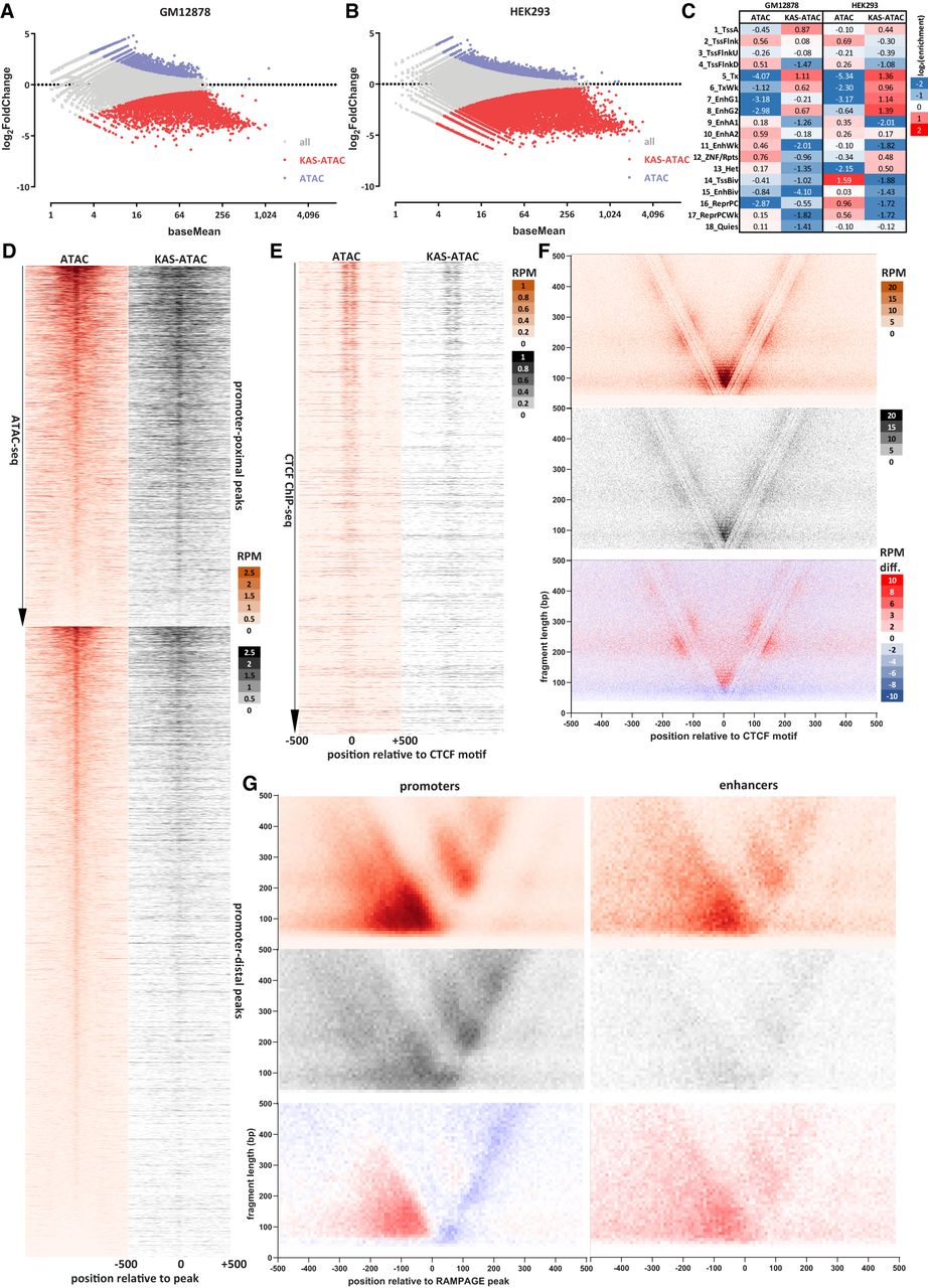 The single-stranded accessible chromatin landscape is distinct from total open chromatin genomic maps. (A) DESeq2 analysis of GM12878 ATAC and KAS-ATAC libraries. (B) DESeq2 analysis of HEK293 ATAC and KAS-ATAC libraries. (C) Enrichment of KAS-ATAC/ATAC differential peaks over ChromHMM chromatin states. Enrichment is calculated as the log2 ratio of the observed versus expected fractions of peaks overlapping each state (based on the overlap of the total set of peaks with ChromHMM states). (D) ATAC-seq and KAS-ATAC profiles around promoter-proximal and distal peaks (GM12878 cells). (E) ATAC-seq and KAS-ATAC profiles around occupied CTCF sites in GM12878 cells (excluding promoter-proximal CTCF peaks; CTCF ChIP-seq peak calls were obtained from ENCODE accession ENCFF827JRI). (F) ATAC-seq, KAS-ATAC, and KAS-ATAC/ATAC differential V-plot (Henikoff et al. 2011) around occupied CTCF sites. (G) ATAC-seq, KAS-ATAC, and KAS-ATAC/ATAC differential V-plot around RAMPAGE (Batut et al. 2013) peaks in promoter and in distal CRE regions (RAMPAGE peaks were obtained from ENCODE accession ID ENCSR000AEI).