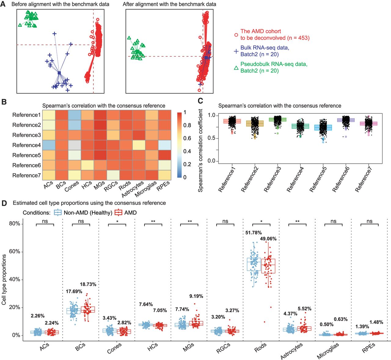 Using DeMixSC to deconvolve a large cohort of human peripheral retinal samples. (A) PCA plots of both the retina cohort data and the benchmark data. Red denotes the bulk data to be deconvolved; blue denotes the benchmark bulk data; and green denotes the benchmark pseudobulk data. (B,C) Panels demonstrating the robustness of DeMixSC to different reference matrices at both the cell type and sample levels. Higher correlation coefficients indicate better performance. (D) Distributions of DeMixSC estimated cell type proportions of Ratnapriya et al. (2019) data using consensus references. Each panel corresponds to a given cell type. The P-values for Student's t-tests comparing the estimated cell type proportions between non-AMD (healthy) and AMD groups are denoted as follows: (ns) not significant, P-value > 0.05; (*) P-value ≤ 0.05; (**) P-value ≤ 0.01; and (***) P-value ≤ 0.001.