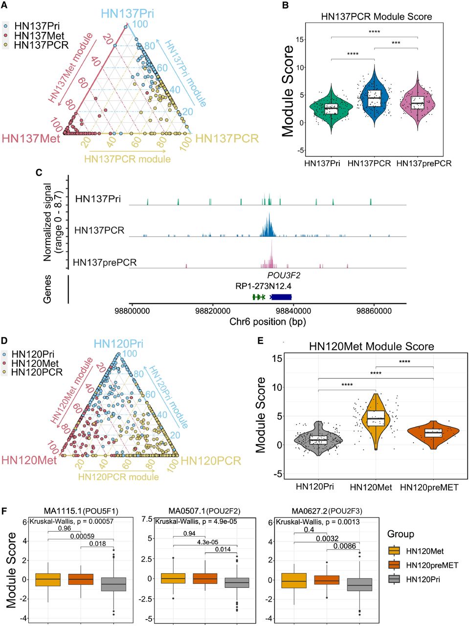 Epigenetic heterogeneity–driven HNSCC progression. (A) Ternary plot showing the ratios of Pri/Met/PCR module scores for patient HN137. (B) Violin plot depicting the recalculated HN137PCR module score after identification of the HN137prePCR subpopulation. (C) CoveragePlot of the POU3F2 locus showing higher H3K27ac localization in HN137prePCR compared with the remaining HN137Pri cells. (D) Ternary plot showing the ratios of Pri/Met/PCR module scores for patient HN120. (E) Violin plot depicting the recalculated HN120Met module score after identification of the HN120preMET subpopulation. (F) Boxplots of ChromVAR scores of several POU-domain containing proteins enriched in HN120Met, showing that the HN120preMET population has higher activity of these TFs compared with the remaining HN120Pri cells. (***) P-value ≤ 0.001, (****) P-value ≤ 0.0001.