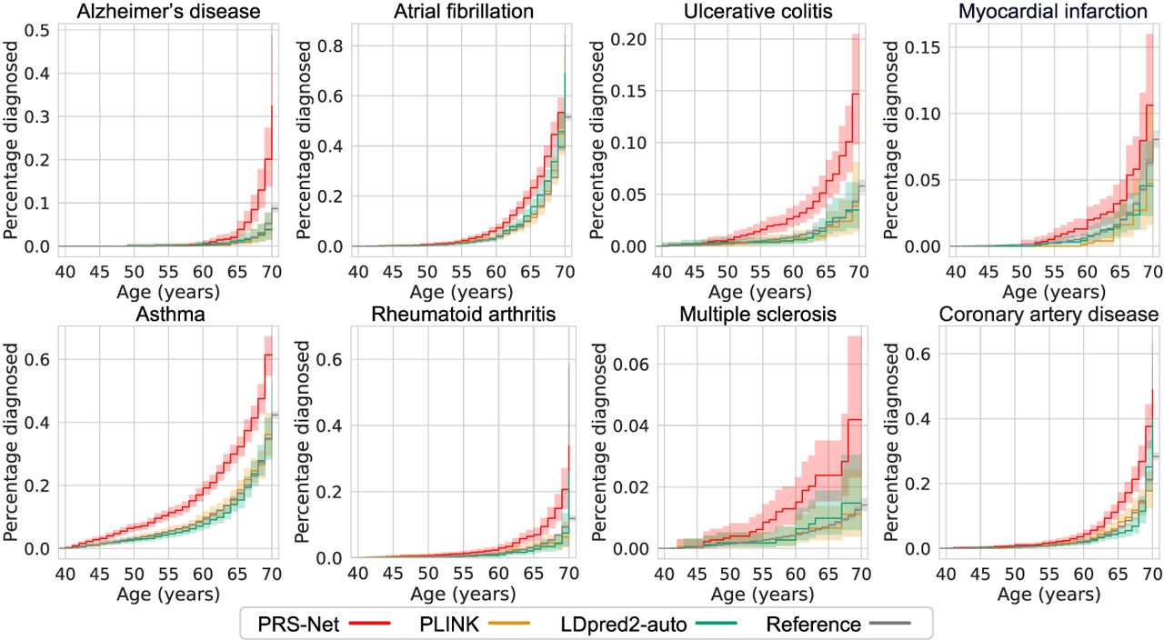The cumulative incidence plots of high-risk individuals (with the highest 5% PRSs) identified by PRS-Net and baseline methods. Each plot illustrates the estimated percentage of individuals diagnosed with a specific disease at different ages. We provide cumulative incidence plots for the original data sets as references. The shaded area denotes the standard error estimated based on six repeats.