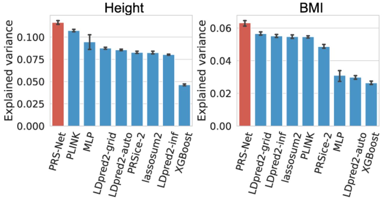 Prediction performance evaluation for quantitative traits (41,028 and 40,411 test samples for height and body mass index [BMI], respectively). Performance was measured in explained variance. The bar plot and error bar denote the mean and standard error, respectively. The training, validation, and testing procedure was conducted for six repeats with different random seeds for each model and each trait.