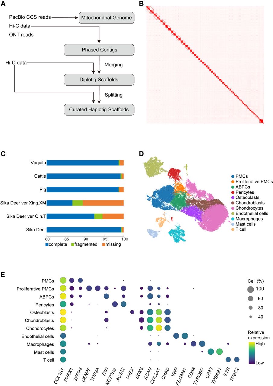Assembly and annotation of the sika deer genome. (A) Workflow of phased genome assembly of sika deer. (B) Hi-C interaction heatmap of phased pseudochromosomes of the sika deer genome. (C) Bar plot of BUSCO evaluation of published genome annotations of sika deer and Cetartiodactyla species in RefSeq. (D) UMAP of cell atlas of antler regeneration based on our genome assembly and annotation. (E) Dot plot of cell marker gene expression profiles in each cell type. Dot size represents the proportion of cells expressing gene in a cell type.