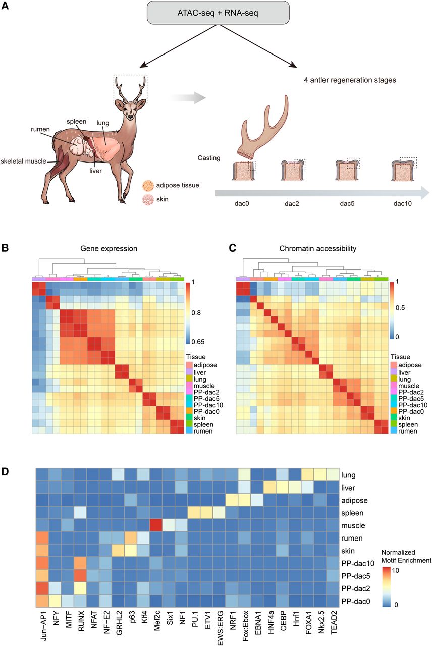 Chromatin accessibility and gene expression landscape for different organs of sika deer. (A) Schematic drawing of the study design covering primary organs and key stages of antler regeneration and collecting paired expression and chromatin accessibility data. (B,C) Hierarchical clustering heatmap of gene expression and chromatin accessibility of sika deer organs. (D) Hierarchical clustering heatmap of a TF-binding motif match profile showing a similar motif profile among self-renewable tissues.