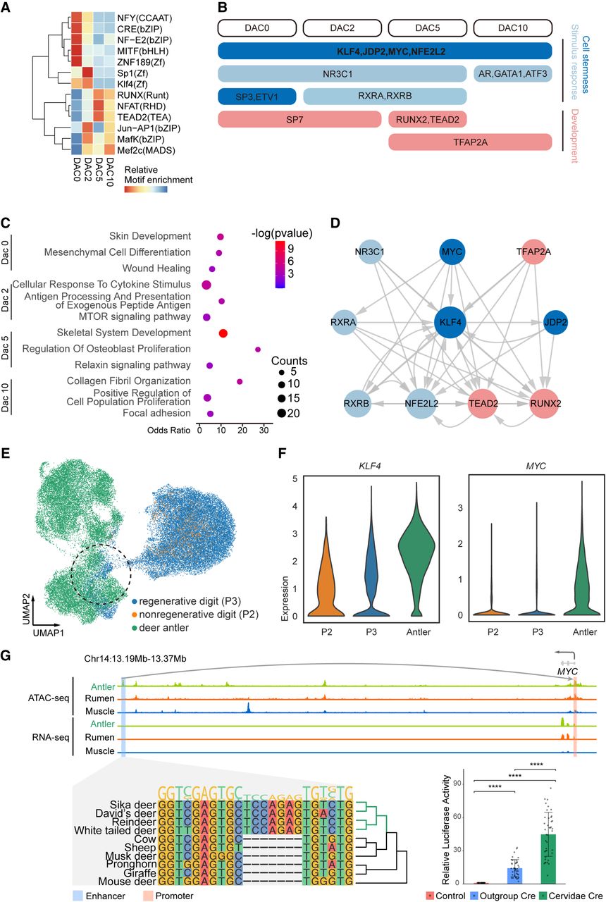 Hub TFs in antler regeneration. (A) Hierarchical clustering heatmap of the top 5 enriched motifs for each stage in antler regeneration. (B) Function and time course schema of top 10 TFs for each stage, suggesting four core TFs and the dynamics from cell stemness and stimulus response to development. (C) Functional enrichment of shared target genes of hub TFs in each antler regeneration stage. (D) Hierarchical structure of 10 hub TFs subnetwork in antler regeneration at dac5 with a similar pattern with time course schema. (E) UMAP projection of PMC cell lineage from antler and mouse digit tips distinguishes PMC of antler and mouse. Dash circle highlights the shared activated stem cell in antler and regenerative digit tip. (F) Higher KLF4 and MYC expression in PMC of deer antler compared with mouse digit tips. (G) Genome track of an antler-specific element near MYC (top), sequence alignment (bottom left), and luciferase assay (bottom right) suggest cervid-specific insertion has significantly increased the expression of MYC in the antler.