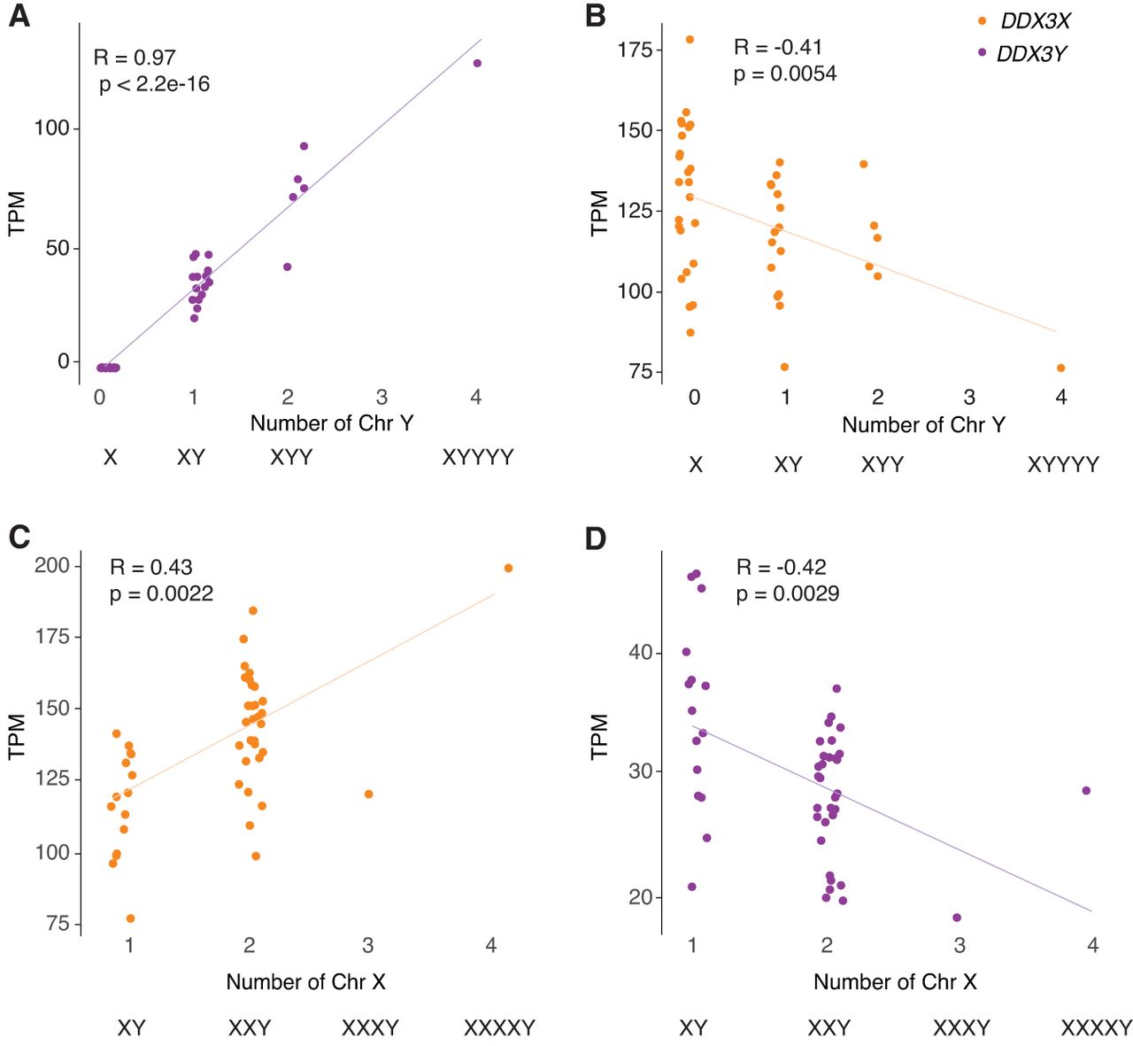 DDX3X and DDX3Y transcript levels are negatively responsive to Chr Y and Chr X copy numbers, respectively. Scatterplots show DDX3X and DDX3Y transcript levels in cultured fibroblasts with the indicated sex chromosome constitutions. Each point represents a primary fibroblast culture from one individual. (A,B) DDX3Y transcript levels are significantly elevated and DDX3X transcript levels significantly reduced in fibroblasts with multiple Chr Y. (C,D) DDX3X transcript levels are significantly elevated and DDX3Y transcript levels significantly reduced in fibroblasts with multiple Chr X. R-values and statistical significance were calculated using Pearson's correlation.