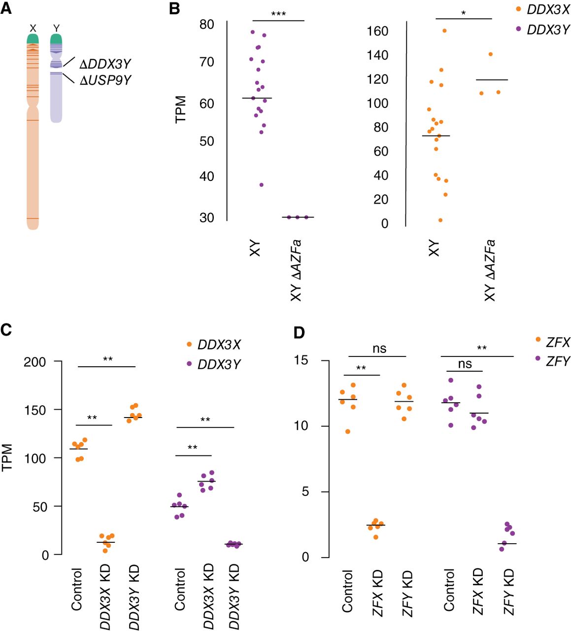 DDX3X and DDX3Y each respond to perturbations in the other's expression. (A) Schematic diagram of naturally occurring Chr Y (AZFa) microdeletion of DDX3Y and USP9Y. (B) DDX3X transcript levels are significantly higher in AZFa-deleted 46,XY LCLs compared with 46,XY LCLs with intact Chr Y. Each point represents a sample from one individual. Statistical significance determined by Mann–Whitney U-test: (***) P < 0.0001, (*) P < 0.05 (C) CRISPRi-mediated knockdown of DDX3Y using two independent gRNAs in three unrelated 46,XY fibroblast cultures results in significantly elevated DDX3X transcript levels. Conversely, DDX3X knockdown results in significantly elevated DDX3Y transcript levels. (D) Reanalysis of CRISPRi knockdown of ZFX or ZFY (San Roman et al. 2024) demonstrates that knockdown of either gene does not result in significant elevation of the homolog's transcripts. Statistical significance determined by ANOVA: (**) P < 0.001.