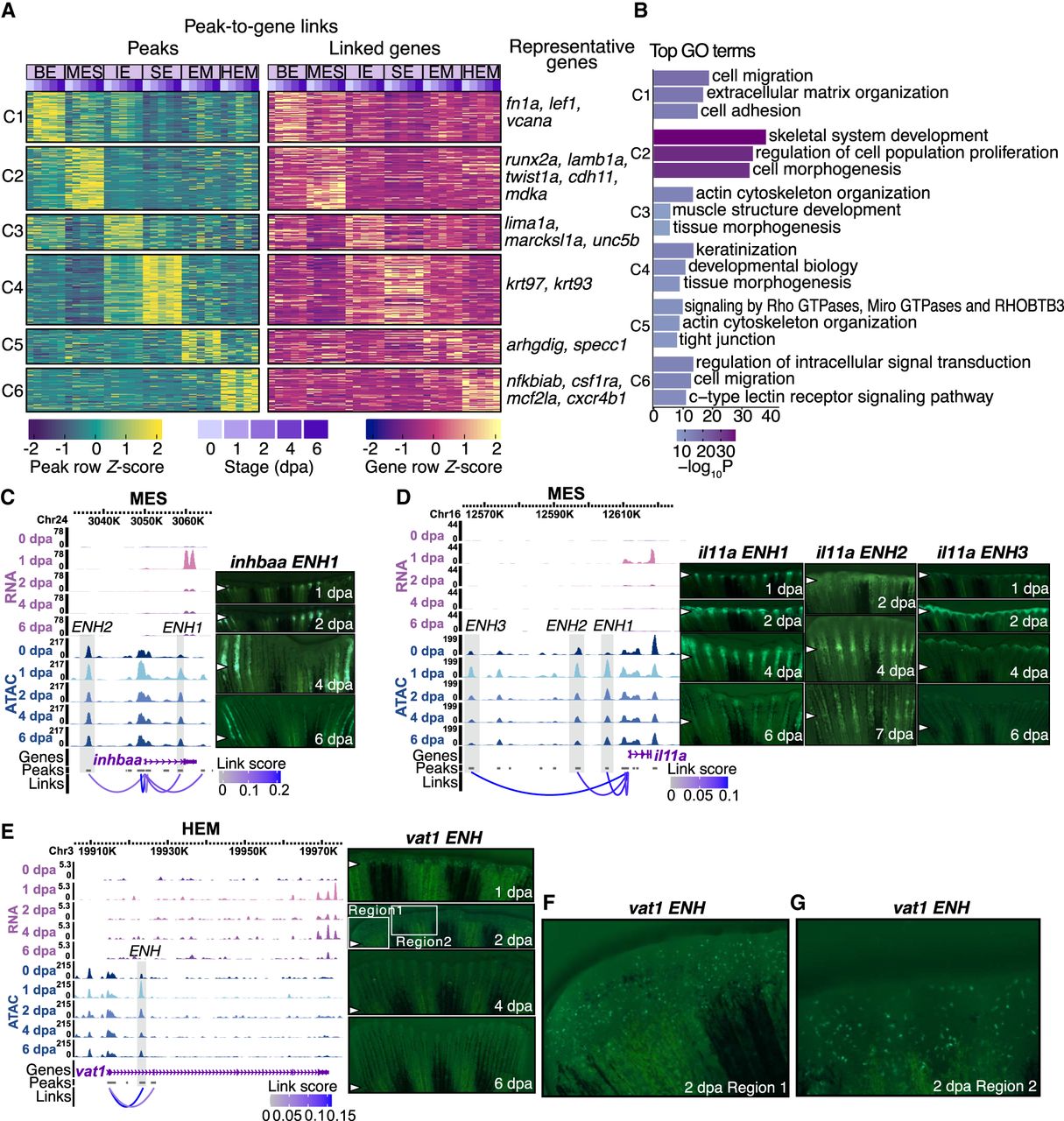 Characterization of common and cell-type-specific cis-regulatory elements in regeneration. (A) Heatmaps display chromatin accessibility (left) and gene expression (right) for peak-to-gene links, with peaks clustered using k-means clustering (k = 6, C1 through C6 represent the six clusters) across cell types and stages. For each cluster, selected highly regulated genes (with more than five linked peaks) relevant to the GO terms in B are displayed next to the gene expression heatmap. (B) Representation of enriched top GO terms associated with the highly regulated genes linked to each peak cluster in A. (C,D) On the left, WashU Epigenome Browser views show aggregated and normalized snRNA-seq signals (pink tracks) and snATAC-seq signals (blue tracks) across time points surrounding genes inhbaa and il11a in MES cells, respectively. Regions of candidate RREs are shaded in gray. Below these signal tracks, the loops illustrate peak-to-gene linkages identified in MES cells. On the right, in vivo enhancer reporter assay results for these enhancer regions are shown across various regenerating stages from F0 zebrafish. The white arrows indicate amputation site. (E) Similar to C and D but presenting a WashU Epigenome Browser view around the gene vat1 in the HEM cells. Candidate RRE is highlighted in gray shades. On the right, in vivo enhancer reporter assay results for this enhancer region are shown across various regenerating stages from F0 zebrafish. The white arrows indicate amputation site. (F,G) Two zoomed-in views from the 2 dpa regenerating fin shown in E.