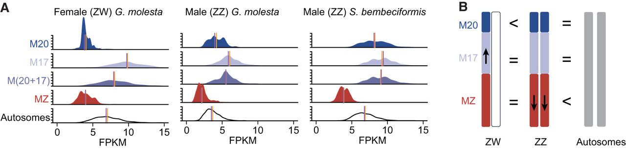 Patterns of sex chromosome dosage compensation (SCDC) of neo-Z in G. molesta. (A) Comparisons of gene expression among chromosomal elements by bootstrapping of FPKM. The purple and yellow lines, respectively, indicate the median of raw FPKM and the average of resampled FPKM medians. The vertical axis shows the distribution density in the range from zero to 0.5. (B) A model of SCDC in the neo-Z Chromosome. The arrows indicate the up- or downregulation of expression in chromosomal elements.