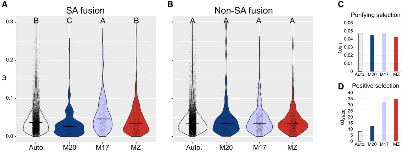 Comparison of molecular evolution rates among chromosomal elements on neo-Z. (A,B) Violin plots of gene-wide ω on different chromosomal elements within the SA fusion (Tortricidae) and non-SA fusion (outgroups) clades. Significant differences from Mann–Whitney U tests (α = 0.01) are marked using uppercase letters. The horizontal lines show the medians. (C,D) Molecular evolution rate (ω) of different chromosomal elements. The term ω0,1, indicates sites under purifying selection (ω0) or neutral evolution (ω1) in both Tortricidae and the outgroups. The term ω2a,2b, indicates sites under purifying selection (ω2a) or neutral evolution (ω2b) in the outgroups but under positive selection in the Tortricidae.