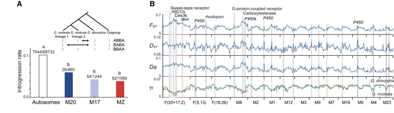 Evolution of neo-Z in two recently diverged species, G. molesta and G. dimorpha. (A) The introgression rates defined as (ABBA + BABA)/(ABBA + BABA + BBAA) among different chromosomal elements. The insert shows the ABBA-BABA pattern with (ABBA + BABA) or without (BBAA) introgression. The significance levels and the raw data of (ABBA + BABA)/(ABBA + BABA + BBAA) are shown at the top of the column. (B) Genomic divergence in patterns of FST, DXY, Da, and π. The 14 longest chromosomes are shown. The gray bars indicate the genomic islands of divergence that overlap with genes.