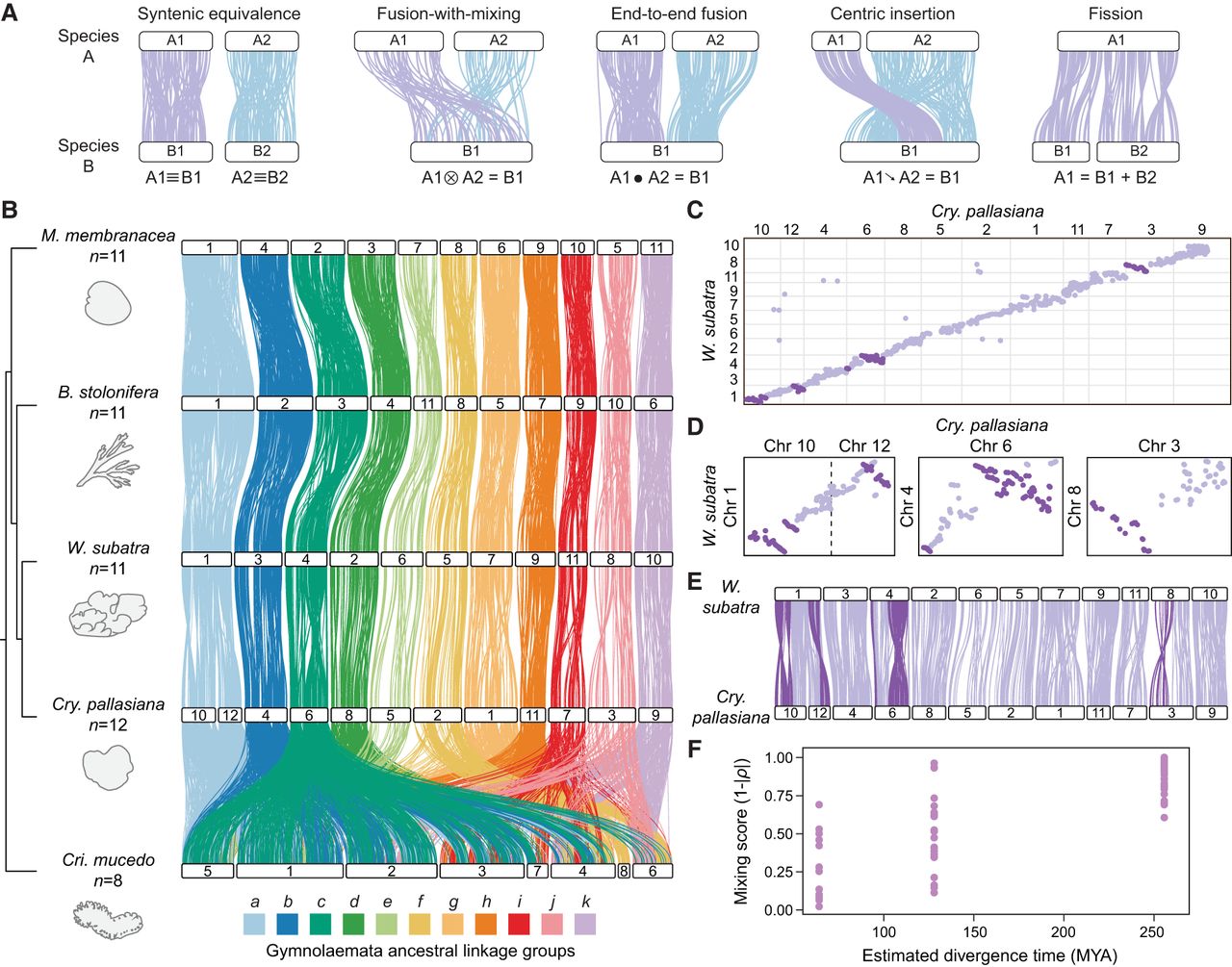 Chromosome rearrangement in gymnolaemate and phylactolaemate bryozoans. (A) Schematic representations of types of inter-chromosomal rearrangement events. White bars represent chromosomes, and colored lines connect orthologous genes; the same color line represents genes in the same ancestral linkage group (ALG). (B) Chromosome-scale gene linkage between five bryozoan species revealed by ribbon plots. Horizontal bars represent chromosomes, and vertical lines connect the genomic position of orthologous genes in each genome. Plot shows 4242 single-copy orthologous genes (average, 386 genes per linkage group). Chromosomes connected by many orthologs are inferred to be homologous (i.e., orthologous chromosomes). In gymnolaemate species, 11 ALGs a to k are highly conserved, although the chromosome containing ALG a underwent a fission event to form Chr 10 and Chr 12 in C. pallasiana. These ALGs are not conserved in the phylactolaemate species C. mucedo. Links between chromosomes sharing five or fewer genes between chromosomes are removed for clarity but can be seen in the Oxford dot plots. (C) Oxford dot plot revealing chromosome-scale gene linkage between the two most closely related species in our data set, C. pallasiana and W. subatra. Each axis represents the entire length of the genome of one species. Gray lines separate chromosomes. Each point represents a pair of orthologs placed by their ordinal position in each genome. Strings of orthologs perpendicular to the main diagonal axis reveal clear intra-chromosomal inversions (dark purple). (D) Single-chromosome Oxford dot plots for C. pallasiana and W. subatra chromosomes with clear intra-chromosomal inversions (dark purple). (E) Ribbon plot for C. pallasiana and W. subatra highlighting intra-chromosomal inversions (dark purple). (F) Microsynteny mixing score versus divergence time for gymnolaemate bryozoan chromosomes across species. Comparisons are grouped by estimated divergence time: <100 million years ago (MYA), C. pallasiana versus W. subatra; 100–150 MYA, C. pallasiana and W. subatra versus B. stolonifera; >250 MYA, C. pallasiana, W. subatra, and B. stolonifera versus M. membranacea. Each point represents a chromosome. The microsynteny mixing score measures how genes are shuffled within a chromosome by intra-chromosomal inversions (see Methods): A higher score indicates more mixing. Mixing scores increase with phylogenetic distance.
