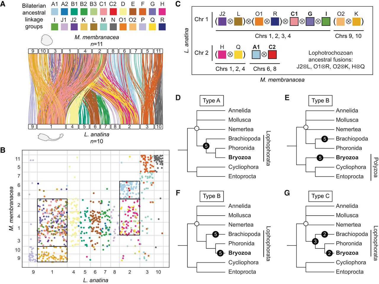 Shared derived chromosome features between bryozoans and brachiopods support the Lophophorata hypothesis. (A) Chromosome-scale gene linkage between the bryozoan M. membranacea and the brachiopod L. anatina. Horizontal bars represent chromosomes. Vertical lines connect the genomic position of orthologous genes in each genome. Lines are colored by bilaterian ALGs. (B) Oxford dot plot showing shared ALG fusion events between L. anatina and M. membranacea. Each point represents a pair of orthologs placed by their ordinal position in each genome, colored by their bilaterian ALG. Black boxes highlight shared fusion-with-mixing events, in which two ALGs appear together on the same chromosome in both species. (C) Representation of the nine ALG fusion-with-mixing events shared between L. anatina and M. membranacea. Colored squares represent ALGs; black lines represent chromosomes; and ⊗ marks ALG fusion-with-mixing events. ALGs J2, L, O1, R, C1, G, I, O2, and K are colocated on Chr 1 in L. anatina. ALGs J2, L, O1, R, C1, G, and I (Chrs 1, 2, 3, 4) and O2 and K (Chrs 9, 10) are also colocated in M. membranacea. Thus, J2 ⊗ L ⊗ O1 ⊗ R ⊗ C1 ⊗ G ⊗ I and O2 ⊗ K represent seven fusion-with-mixing events shared by both species. ALGs H, Q, A1, and C2 are colocated on Chr 2 in L. anatina. H and Q (Chrs 1, 2, 4) and A1 and C2 (Chrs 6, 8) are also colocated in M. membranacea. Accordingly, H ⊗ Q and A1 ⊗ C2 represent two additional fusion-with-mixing events shared by both species, for a total of nine. We note that several spiralian phyla share four of these events (“lophotrochozoan ancestral fusions”), represented by ⊗ within parentheses, although their timing remains uncertain. If these events are present in all spiralians, for instance, they may not be useful phylogenetic markers for the position of bryozoans. This leaves five confirmed derived fusion-with-mixing events (highlighted in bold) shared between bryozoans and brachiopods but not present in molluscs and annelids. These events suggest a close evolutionary relationship between bryozoans and brachiopods and are marked by ⊗ occurring outside of parentheses: (J2 ⊗ L) ⊗ (O1 ⊗ R) ⊗ C1 ⊗ G⊗I and A1 ⊗ C2. (D–G) Visual representation of four possible evolutionary scenarios that could give rise to the five derived fusion-with-mixing events shared between bryozoans and brachiopods (types A, B, and C). An open circle marks the base of the Lophotrochozoa. Black circles mark chromosome fusion-with-mixing events. (D) Scenario type A: Brachiopods, phoronids, and bryozoans are closely related, forming the Lophophorata. The five fusion-with-mixing events shared between bryozoans and L. anatina occurred in the ancestor of the Lophophorata. Total number of fusions required: five. (E) Scenario type B-1: Bryozoans, Cycliophora, and Entoprocta are closely related, forming the Polyzoa. Bryozoans are distantly related to brachiopods. The five fusion-with-mixing events shared between bryozoans and L. anatina occurred independently in bryozoans and brachiopods. Total number of fusions required: 10. (F) Scenario type B-2: Brachiopods, phoronids, and bryozoans are closely related, forming the Lophophorata. The five fusion-with-mixing events shared between bryozoans and L. anatina occurred independently in bryozoans and brachiopods. Total number of fusions required: 10. (G) Scenario type C: Brachiopods, phoronids, and bryozoans are closely related, forming the Lophophorata. Some of the five fusion-with-mixing events shared between bryozoans and L. anatina occurred in the ancestor of Lophophorata, whereas some occurred independently in bryozoans and brachiopods. Total number of fusions required: six to nine.