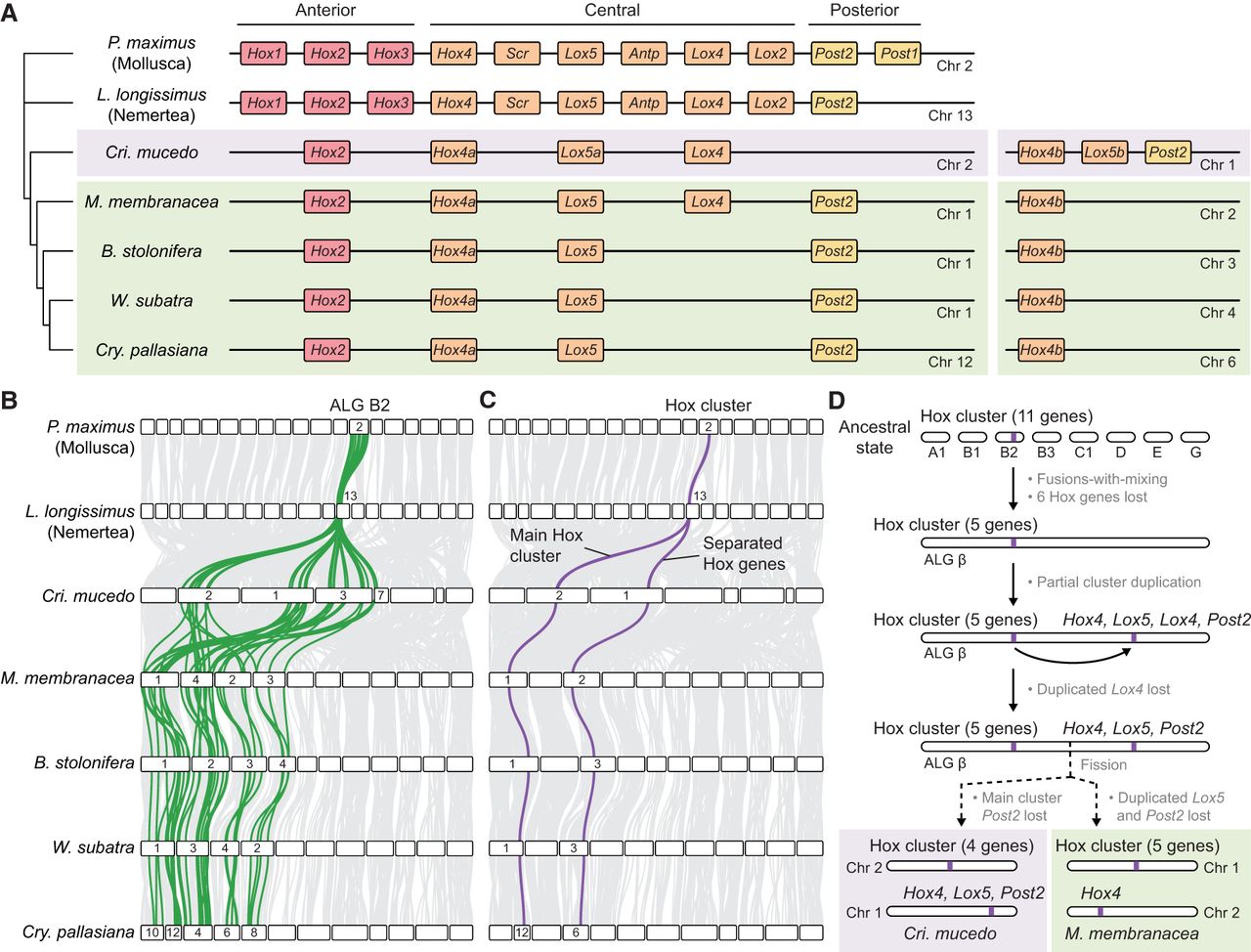 Evolution of the bryozoan Hox cluster. (A, left) Representation of the main Hox cluster of bryozoans and two outgroups: the nemertean L. longissimus and the mollusc P. maximus. Colored rectangles represent Hox genes. Horizontal black lines represent chromosomes. (Right) Separate Hox genes located on different chromosomes. (B) Positions of ALG B2 genes (green) in bryozoan genomes. (C) Positions of Hox genes (purple) in bryozoan genomes. (D) Representation of the evolutionary events that resulted in observed bryozoan Hox gene arrangements. In the bryozoan ancestral lineage, chromosomes containing bilaterian ALGs A1, B1, B2 (including the Hox cluster), B3, C1, D, E, and G underwent sequential fusion events to form bryozoan ALG β; the Hox cluster underwent a partial duplication, copying genes Hox4, Lox5, Lox4, and Post2; and the duplicated Lox4 gene was subsequently lost. In the lineage leading to C. mucedo (Phylactolaemata), the main cluster Post2 was lost, and the chromosome containing ALG β underwent fission, leaving the main cluster on Chr 2 and duplicated genes on Chr 1. In the lineage leading to M. membranacea (Gymnolaemata), the duplicated Lox5 and Post2 were lost, and the chromosome containing ALG β underwent fission, leaving the main cluster on Chr 1 and duplicated genes on Chr 2.