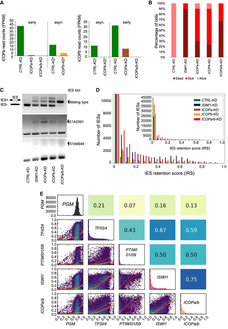 Effects of ICOP knockdowns (KDs) on DNA excision. (A) mRNA expression levels in fragments per kilobase per million mapped reads (FPKM) compared between ICOPa and ICOPb KDs for transcripts early in development (40% old MAC fragmentation) or asynchronous (asyn.) cultures (*) in which new MACs were observed in 20% of cells but the majority of the cells were in early development. ICOPa/b indicates cosilencing of ICOPa and ICOPb. (B) Survival of recovered postautogamous KD cells followed for several vegetative divisions. Alive (pink): four divisions per day; sick (red): fewer than three divisions per day; dead (cayenne): no cells. (C) Retention of mating type, 51A2591 and 51A6649 IESs. ISWI1-KD: positive control. Retained IESs (IES+) result in a larger amplicon. (D) Genome-wide IES retention scores (IRS) across ∼45,000 IESs in different KDs. (E) Correlation of IRSs among KDs. Diagonal indicates IRS distributions of individual KDs; below diagonal, correlation graphs of pairwise comparisons; above diagonal, corresponding Pearson correlation coefficients; red lines, ordinary least-square (OLS) regression; orange lines, LOWESS; and gray lines, orthogonal distance regression (ODR).