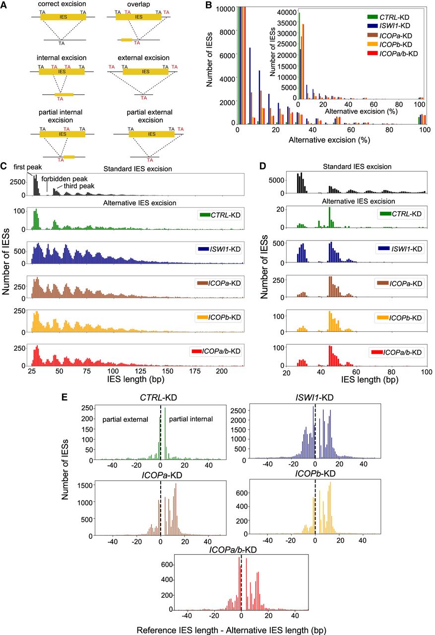 Alternative IES excision in ICOP and other relevant KDs. (A) Schematic representation of analyzed IES excision events. (B) Distribution of genome-wide alternative IES excision (percentage per IES) for different KDs. (C) Length distribution of alternatively excised IESs for each KD. The reference length distribution for all IESs is given above (“standard IES excision”). (D) Origin of alternatively excised IESs in the “forbidden” peak. The reference length is plotted for all alternatively excised 34–44 bp IESs. (E) Length distribution of partial external and partial internal alternative excision events for the KDs.