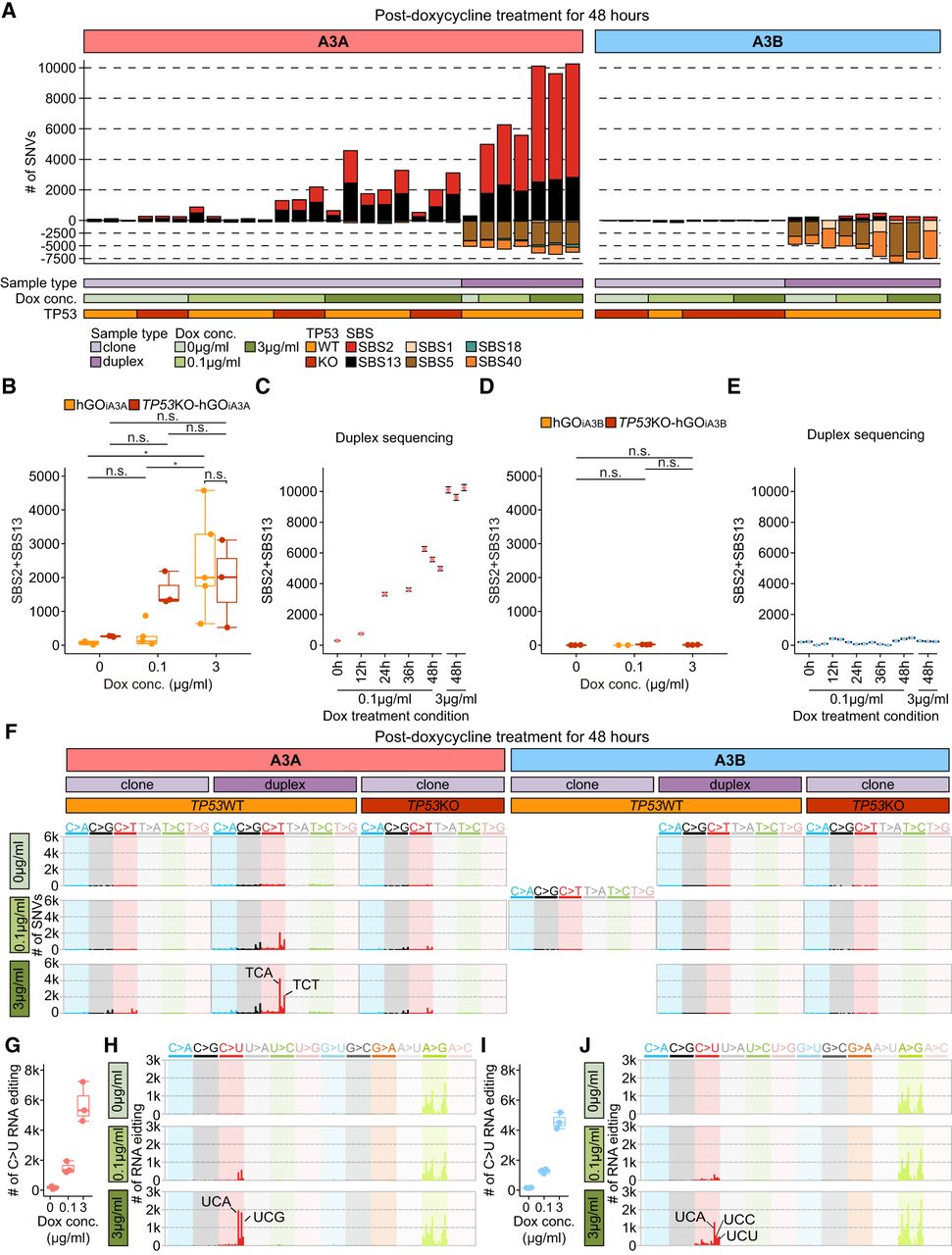 Mutational impact of APOBEC-associated single base substitutions in DNA and RNA. (A) Mutational burden of SNVs following APOBEC overexpression (A3A or A3B), measured by whole-genome sequencing of the clones and duplex DNA sequencing. The number of SNVs measured by the duplex DNA sequencing was normalized per diploid genome; (left) hGOiA3A lines, and (right) hGOiA3B lines. (B) Mutational burden of APOBEC-associated SNVs in the hGOiA3A and TP53KO-hGOiA3A clone sequencing. The number of A3A-associated SNVs (SBS2+SBS13) in hGOiA3A and TP53KO-hGOiA3A clones under each condition. Statistical significance was determined using a t-test: (*) P < 0.05, (n.s.) not significant. (C) Number of A3A-associated SNVs (SBS2+SBS13; normalized per diploid genome) in BotSeqS results for hGOiA3A lines under each doxycycline treatment condition. Black lines represent 95% confidence intervals based on a Poisson distribution. (D) Mutational burden of APOBEC-associated SNVs in the hGOiA3B and TP53KO-hGOiA3B clone sequencing; the number of A3B-associated SNVs (SBS2+SBS13) in hGOiA3B and TP53KO-hGOiA3B clones under each condition. Statistical significance was determined using a t-test. (E) Number of A3B-associated SNVs (SBS2+SBS13; normalized per diploid genome) in BotSeqS results for hGOiA3B lines under each doxycycline treatment condition. Black lines represent 95% confidence intervals based on a Poisson distribution. (F) Mutational burden and spectra of APOBEC-associated SNVs in each experimental condition. The number of SNVs in BotSeqS results were normalized per diploid genome; (left) hGOiA3A lines, and (right) hGOiA3B lines. (G) Number of C > U RNA editing in bulk RNA-seq in hGOiA3A lines (n = 3 per condition), normalized per 3.1 Gb of mapped bases. (H) Spectra of RNA editing in trinucleotide contexts in hGOiA3A lines. (I) Number of C > U RNA editing in bulk RNA-seq in hGOiA3A lines (n = 3 per condition), normalized per 3.1 Gb of mapped bases. (J) Spectra of RNA editing in trinucleotide contexts in hGOiA3B lines.