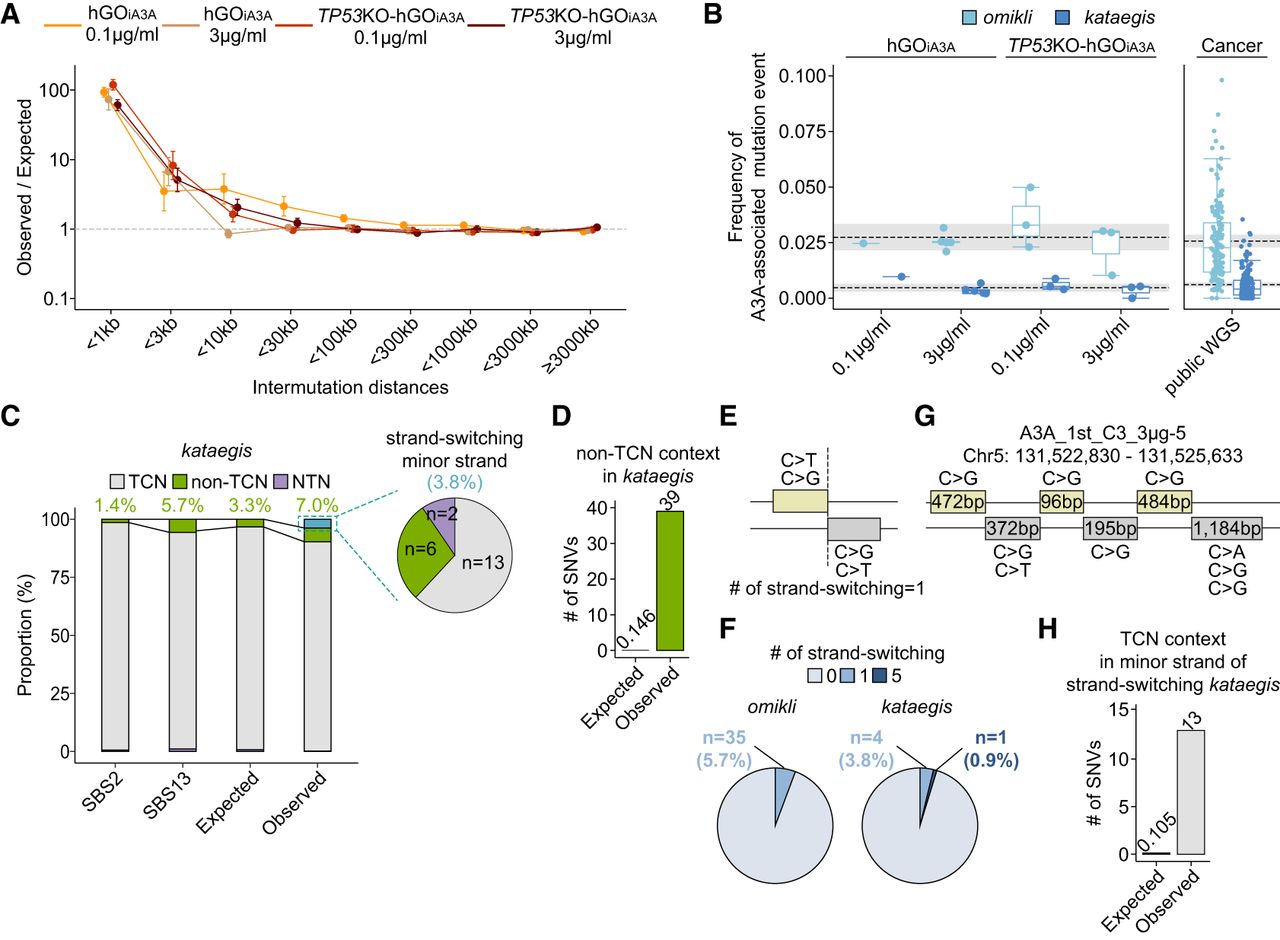Landscape of APOBEC3A-associated clustered mutation. (A) Observed-to-expected ratios of the intermutational distances between SNVs in each clone. Data are presented as mean ± standard error. (B) Frequencies of clustered mutation events (omikli and kataegis) among A3A-associated base substitutions in clones and cancer genomes. (C) Proportions of classic (in TpCpN context) and nonclassical mutations (in non-TpCpN and NpTpN) in SBS2, SBS13, and kataegis regions in the clones. (D) Comparison of expected and observed number of SNVs in the non-TpCpN context within kataegis regions. (E) Schematic representation of strand-switching kataegis. (F) Strand-switching frequencies of omikli and kataegis across classes of clustered mutation events. (G) A complex strand-switching kataegis involving five switches found in clone A3A_1st_C3_3µg-5. (H) Enrichments of minor strand mutations in the TpCpN context in strand-switching kataegis events.