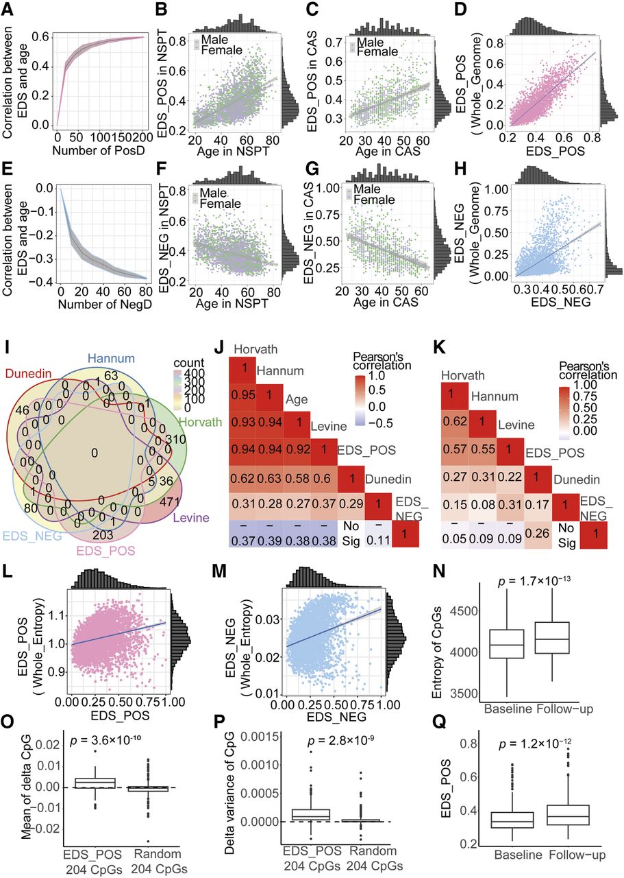 Validation and aging associations of the epigenetic drift score. (A) EDS_POS shows increasing correlation with age as more positive drift-CpGs are included. (B,C) Scatter plots of EDS_POS versus age in NSPT (B) and CAS (C), colored by gender. (D) EDS_POS significantly correlates with genome-wide positive EDS. (E–G) EDS_NEG similarly shows increasing age correlation (E) and gender-stratified associations in NSPT (F) and CAS (G). (H) EDS_NEG correlates with genome-wide negative EDS. (I) Venn diagram showing CpG overlap between EDS and four aging clocks. (J,K) Heat maps of correlations among EDS, aging clocks, and age, before (J) and after (K) age adjustment. (L,M) EDS_POS (L) and EDS_NEG (M) correlate with genome-wide methylation entropy. (N) Methylation entropy increases longitudinally over 4 years. (O–Q) EDS_POS CpGs show greater increases in methylation mean (O), variance (P), and EDS score (Q) over time compared to random CpGs.