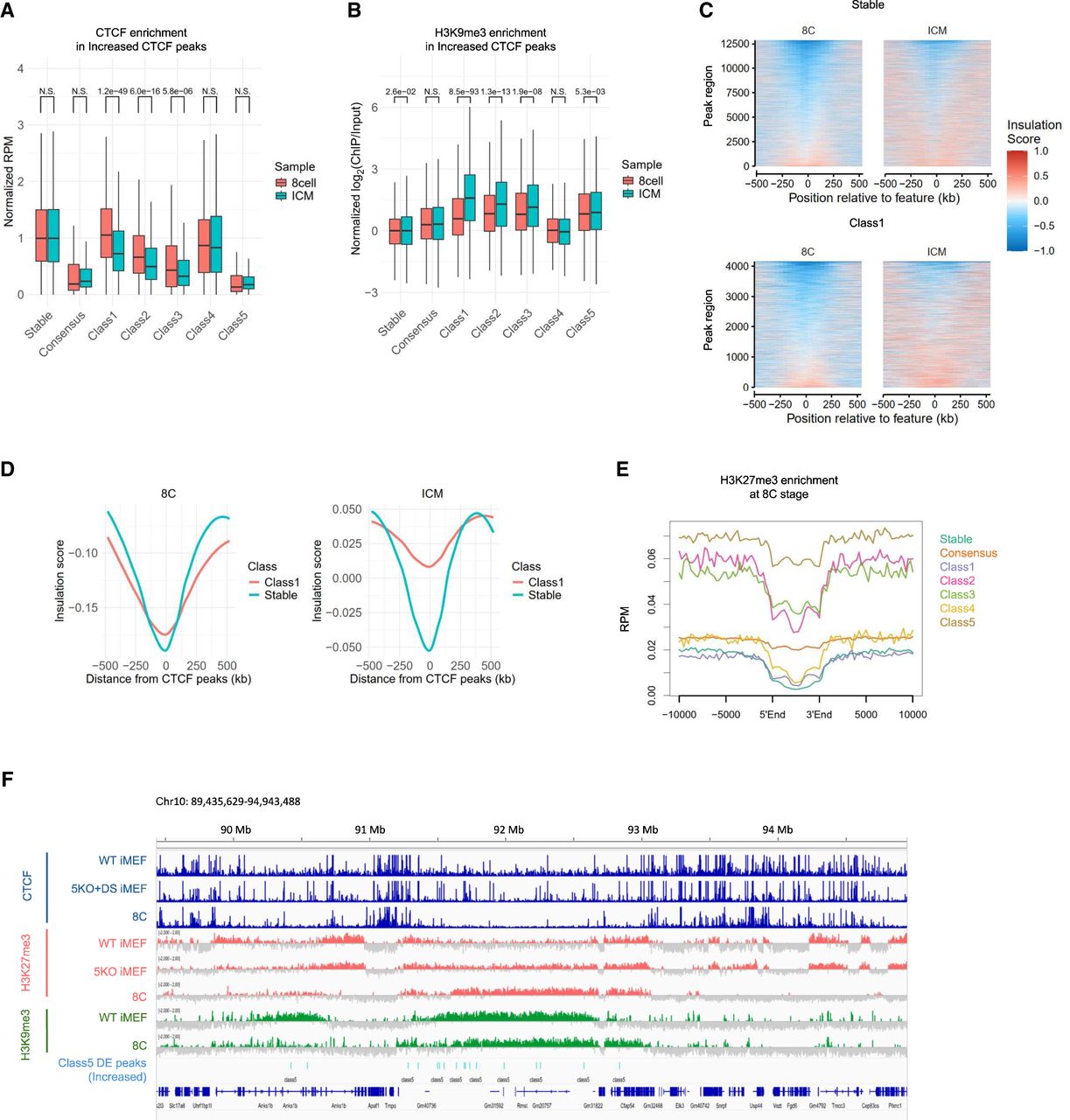 Association of DE peaks with 3D genome structures in mouse early embryos. (A) CTCF accumulation in “Increased” DE peaks in early mouse embryos. The y-axis represents CTCF accumulation, corrected by the median value of Stable CTCF peaks in each developmental stage. CTCF accumulation in DE peaks is tested between the eight-cell stage and ICM using a t-test. (B) H3K9me3 accumulation in “Increased” DE peaks in early mouse embryos. The y-axis represents H3K9me3 accumulation (log2[ChIP/Input]), corrected by the median value of Stable CTCF peaks in each developmental stage. H3K9me3 accumulation in DE peaks is tested between the eight-cell stage and ICM using a t-test. (C,D) A tornado plot showing the insulation status in Stable and “Increased” Class1 DE peaks in eight cells and ICM. Panel C displays the results for each region in a heat map, and panel D shows the average values of regions. The x-axis represents the distance from CTCF peaks. (E) Enrichment of H3K27me3 in the eight-cell stage around “Increased” DE peaks. Class 5 is embedded in regions with high H3K27me3 enrichment. (F) Representative regions of “Increased” Class5 DE peaks embedded in H3K27me3 enriched regions in the eight-cell stage.