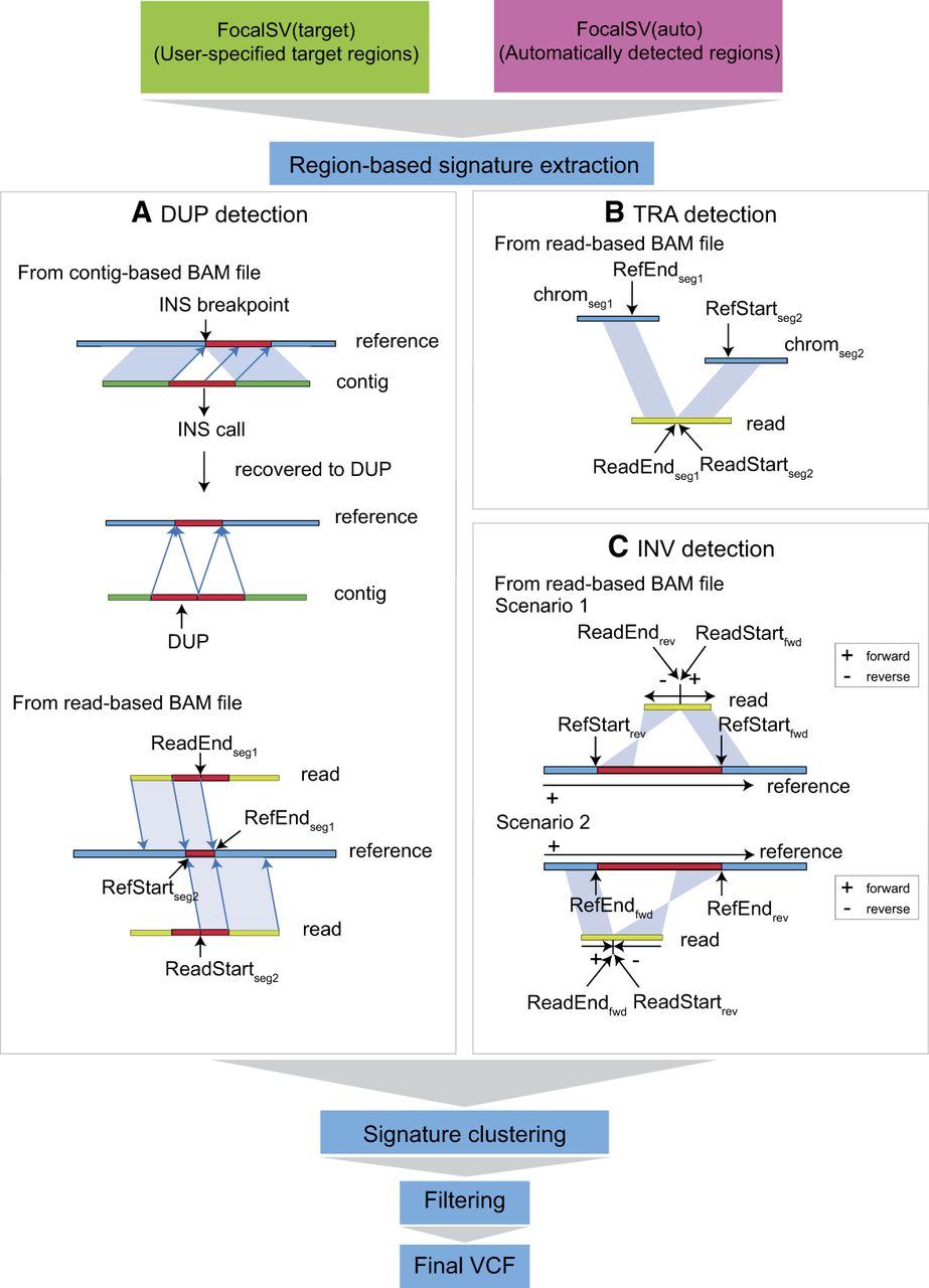 Schematic diagram of duplication, translocation, and inversion breakpoint signatures detected by FocalSV. (A) Duplication: duplications can be identified using both contig-based and read-based BAM files. In a contig-based BAM file, a duplication is detected when an insertion call shows the alternate allele mapped to the surrounding sequence of the insertion breakpoint. In a read-based BAM file, a duplication signature is identified when two adjacent segments of a read align to overlapping regions on the reference genome in the same orientation. (B) Translocation: translocations are inferred when two adjacent segments of a read align to different chromosomes. (C) Inversion: inversions are detected when two adjacent segments of a read align in opposite orientations. Additional details on detecting duplications, translocations, and inversions can be found in the Methods section.