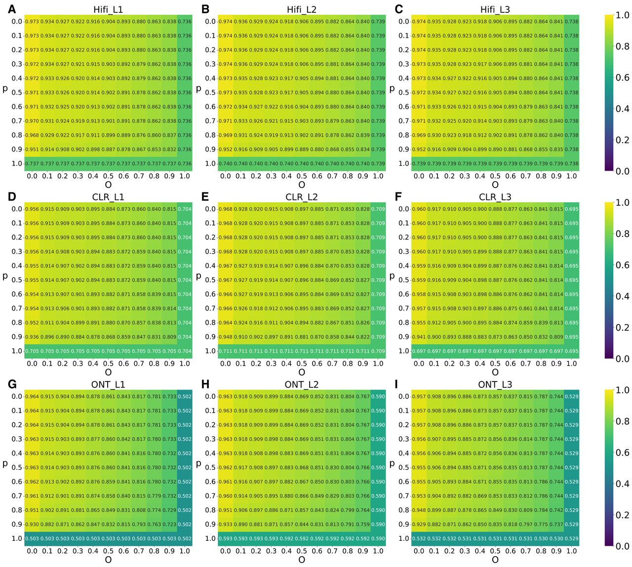 Deletion F1 accuracy of FocalSV(auto) by tuning different evaluation parameters (p and O). O is the minimum reciprocal overlap between SV call and gold standard SV. p is the minimum percentage of allele sequence similarity between SV call and gold standard SV. O and p vary from 0 to 1 with a 0.1 interval. (A–C) The F1 heat map for deletions by FocalSV(auto) on three HiFi data sets. Every cell in the heat map represents the F1 score under a specific pair of p and O evaluation. (D–F) The F1 heat map for deletions by FocalSV(auto) on three CLR data sets. (G–I) The F1 heat map for deletions by FocalSV(auto) on three ONT data sets.