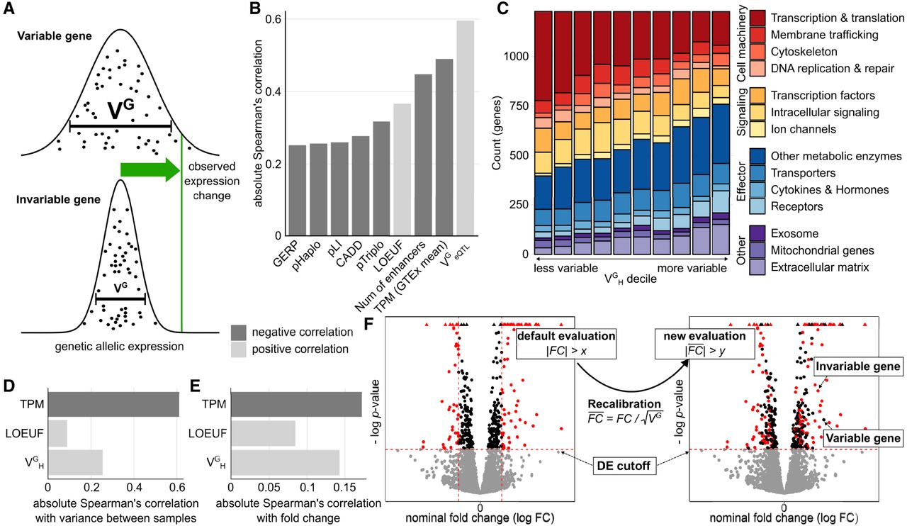 general population. VG is an estimate of this population variance. (B) Correlation of VGH with other gene metrics. Negative correlations are colored dark gray; positive correlations are light gray. (C) Distribution of functional categories in genes split by VGH decile. Some functional categories like transcription- and translation-associated genes were enriched for small VGH estimates, and others, like receptors, were enriched for high VGH estimates. (D) Correlation of gene metrics with experimental gene expression variance. Data sourced from Alasoo et al. (2018) studying the effects of IFNG treatment on 81 human macrophage samples. (E) Correlation of gene metrics with absolute gene expression changes in the IFNG experiment. (F) Concept of gene expression recalibration using VG. As a result of this process, genes are prioritized not by nominal log fold change (FC) but by recalibrated log fold change (