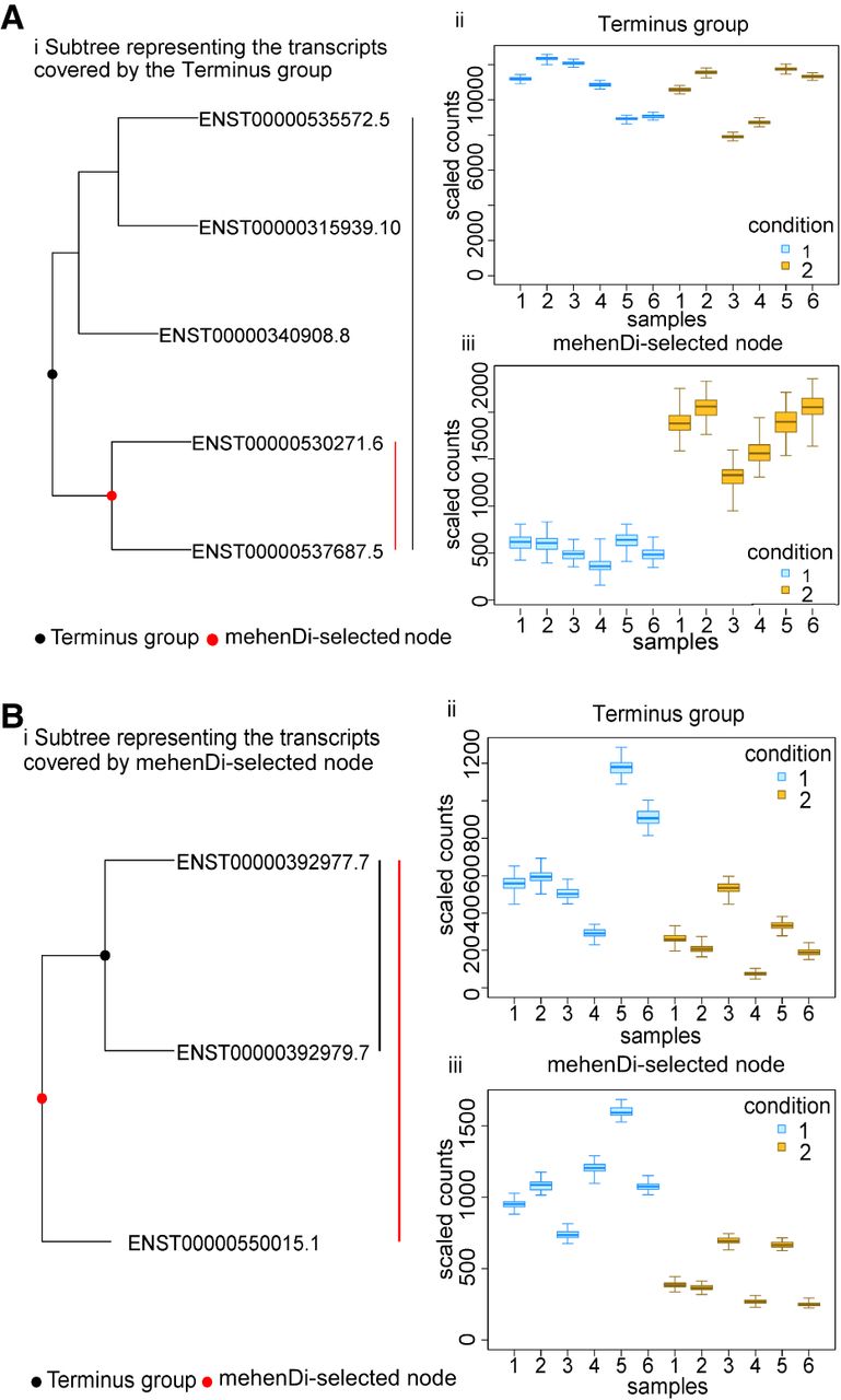 Comparison of mehenDi with Terminus where mehenDi is able to find signal that is lost by Terminus groups. (A) Example of a mehenDi node that is overaggregated in Terminus for the BrSimNorm data set. (i) Subtree representing the transcripts covered by the Terminus group. (ii) Inferential replicates for the Terminus group. (iii) Inferential replicates for the selected node output by mehenDi. (B) Example of a mehenDi node that is not aggregated enough in Terminus for the BrSimNorm data set. (i) Subtree representing the transcripts covered by the mehenDi group. (ii) Inferential replicates for the Terminus group. (iii) Inferential replicates for the selected node output by mehenDi.