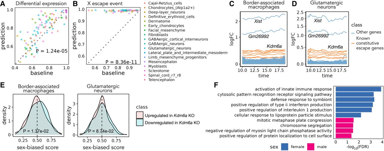 Sex differences in mouse embryonic development. (A) Pairwise comparison of Sunbear prediction and the nearest neighbor baseline in recapitulating differential expression patterns in sex-matched time points. Each dot indicates the AUROC score of recapitulating female-/male-biased patterns in each sex-matched time point and cell type. (B) Similar to in A, pairwise comparison of Sunbear prediction and the nearest neighbor baseline in ranking escape genes to be more female-biased than all other genes on the X Chromosome. (C,D) Predicted temporal sex-biased log fold change in glutamatergic neurons and border-associated macrophages. Each line represents a gene that is predicted to be consistently higher in females than males and is colored by whether the gene is a known constitutive escape gene or not. (E) Distribution of predicted sex-biased scores of genes (0 = extremely male-biased, 1 = extremely female-biased), grouped and colored by whether the gene is upregulated (pink) or downregulated (blue) in Kdm6a KO versus WT samples in CD4+ cells. P-values are calculated by one-sided Wilcoxon rank-sum tests. (F) Gene Ontology biological processes enriched in consistently female- and male-biased genes in border-associated macrophages. Nonredundant terms with the smallest FDR are selected for visualization. No enrichment of biological processes is found in glutamatergic neurons.