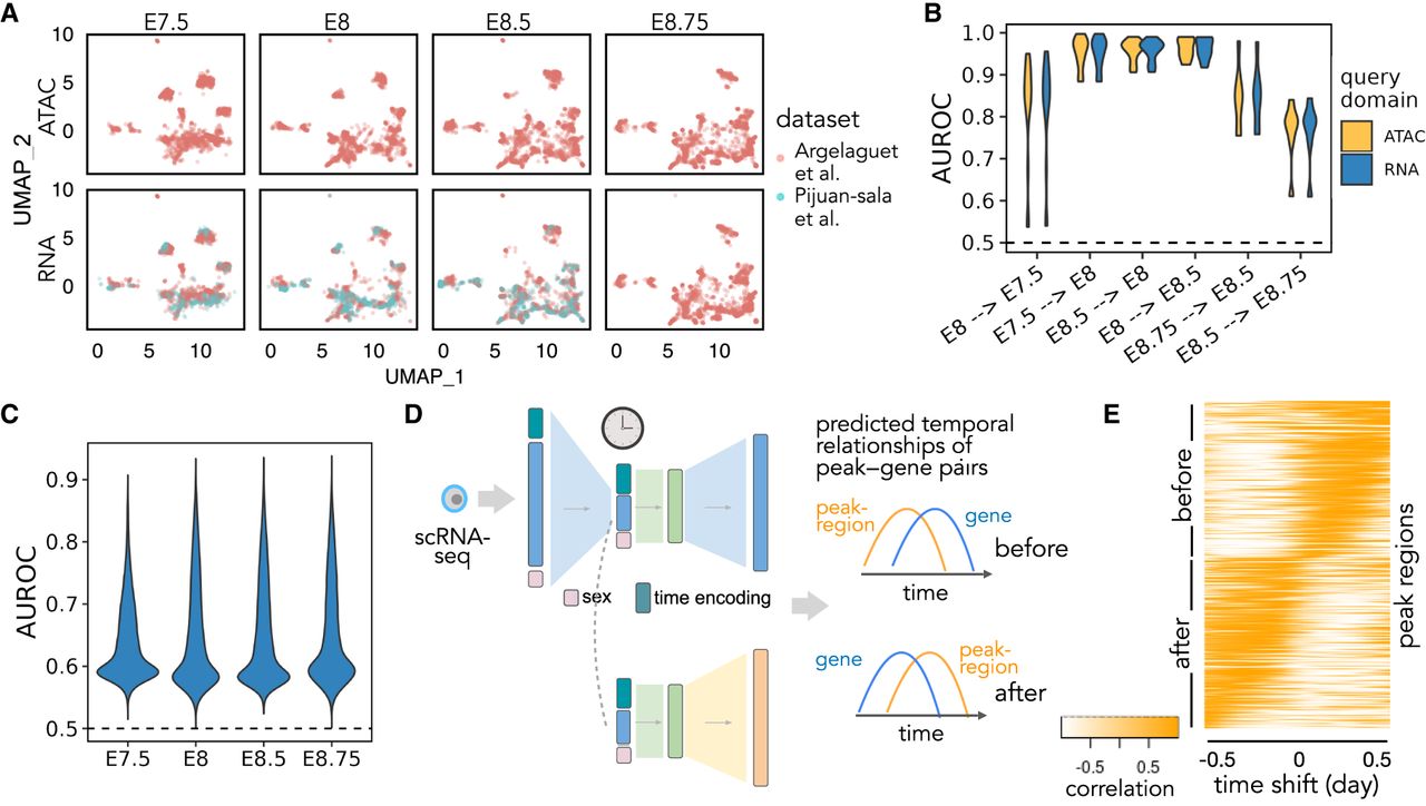 Multimodal temporal inference. (A) A UMAP embedding suggests that scRNA-seq and scATAC-seq profiles are well aligned across time and batch. Only time points with both scRNA-seq and scATAC-seq available are shown. (B) AUROC of the predicted differential accessibility pattern relative to those derived from the original data sets. AUROC is calculated per cell type, and differential accessibility is calculated between each held-out time point and each query time point (shown as “query time point → held-out time point”). (C) Peak-wise AUROC of scATAC-seq profiles predicted based on scRNA-seq relative to the original scATAC-seq profile in each held-out time point. AUROCs are calculated across all cells. (D) Workflow for calculating the dynamic association between peaks and genes. A query cell's scRNA-seq profile is fed into Sunbear to predict temporal patterns of gene expression and chromatin accessibility. For each pair of chromatin region and its proximal gene, we calculate the correlation coefficient between them with incremental time shifts, which results in a TLCC vector (column). (E) Visualization of predicted peak region–gene relationships. Heatmap of TLCC matrices on randomly selected 5000 peak regions with accessibility changes ahead of (“before”) or subsequent to (“after”) nearby gene expression. Peak regions are sorted based on the time shift with the maximum TLCC.