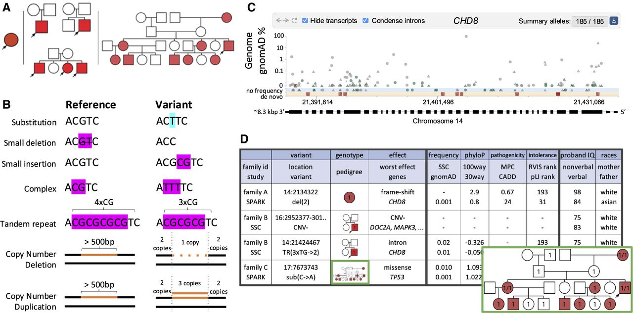 General features of GPF. (A) GPF supports various family structures represented as pedigree diagrams, in which parent–child relationships are shown with lines; males and females with squares and circles, respectively; and phenotypes with colors. In this panel, red indicates individuals with autism, and white indicates those without. Shown are a family with a single individual (left), three nuclear families (two parents and their children; middle), and a complex multigenerational family (right). Arrows indicate the probands. (B) GPF supports various genetic variant types represented relative to a reference genome, including substitutions, short insertions and deletions, copy-number variants, and tandem repeats (or microsatellites). (C) The gene view component shows the population (or summary) variants in a gene of interest. The gene view represents the genomic location of the variants on the x-axis in the context of the gene isoforms and the variant frequencies on the y-axis. Stars, triangles, and circles are likely-gene disruption (LGD), missense, and synonymous variants, respectively. Red squares indicate de novo variants. (D) The family variants view, organized into three sections, displays variants that segregate within families. The first section shows the family (the family ID/study column), the variant (the location/variant column), the segregation pattern (the pedigree column), and the variant's predicted effect on the protein-coding genes (the worst effect/genes column). In the segregation patterns, numbers indicate the alternative alleles segregating in the family. For example, an individual with “1” is heterozygous with a first alternative allele and a reference allele, and an individual with “1/1” is homozygous with two alternative alleles. The second section shows the GPF's extensive genomic annotations assigned to each variant. The third section shows relevant phenotypic measures of the probands or their family members.