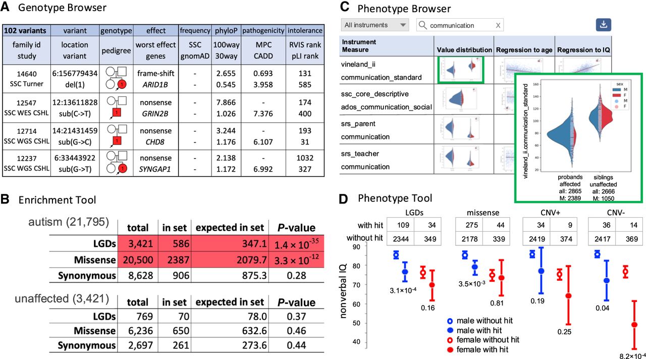 Query and statistical tools at GPF. (A) The genotype browser enables users to construct complex queries that involve the properties of genetic variants, the properties of affected genes, and the phenotypic properties of carrier individuals (Supplemental Fig. 1). Here, we partially present the results of a query for de novo LGD variants that fall within the FMRP target gene set and occur in children diagnosed with autism (for a description of the columns, see Fig. 1D). (B) The enrichment tool (Supplemental Fig. 2) enables users to test for enrichment of de novo variants within a gene set. The enrichment tool results for de novo mutations are shown in children with autism and unaffected children from the autism-related subset of the sequencing de novo “SD autism” in the FMRP target gene set. The top table shows that among 21,795 individuals with autism, 3421 de novo LGD mutations are found (N). Of these, 586 fall in FMRP target genes (O), although we expect to see only 347 (E). This corresponds to an enrichment with a significant P-value (pV), indicated with a red background. Missense mutations are similarly enriched in FMRP target genes. However, synonymous mutations are not enriched (white background). The bottom table shows the same analysis for unaffected individuals, which finds no enrichment for LGD, missense, or synonymous mutations. (C) The phenotype browser allows users to explore the available phenotypic data associated with a data set and download the subsets of interest. The panel shows a part of the search results for phenotypic measures related to “communication” in the SSC data set. The results are presented in a table, with one row per measure. For each measure, the table includes histograms of its values, separately in groups of individuals by gender, role, and affected status. The zoomed-in view (a feature provided by GPF) of the histograms plot for the communications_standard measure from vineland_ii shows the number of individuals for which the measure is available for the affected probands and the unaffected siblings separately by males and females and the histograms of the four groups (male and female probands and male and female siblings). The histograms show that the affected probands have diminished vineland_ii communication scores. The result table also displays the scatter plots and regression lines for each of the four measures against the individuals’ ages at assessment and their IQs. (D) The phenotype tool enables users to test whether a given phenotypic measure (e.g., nonverbal IQ) differs between SSC children who carry a specified type of genetic variant (e.g., de novo LGDs) and those who do not have such variants (Supplemental Fig. 3). The panel illustrates the impact of four de novo variant types (LGD; missense; CNV+, or large duplications; and CNV−, or large deletions) in genes with a low pLI rank (less than 1000) on nonverbal IQ. For each de novo variant type, the mean and 95% confidence interval are plotted for four groups of individuals: males and females with and without a de novo variant in the selected genes. There is a significant decrease in nonverbal IQ for affected children with de novo LGDs or CNV− within the genes with a low pLI rank. There is no effect of CNV+ mutations, and only a marginal effect is observed for missense variants. We note that panels B and D are stylized versions of content from GPF-SFARI, with reduced white space for better clarity. Supplemental Figures 2 and 3, respectively, illustrate the result representation generated by GPF.