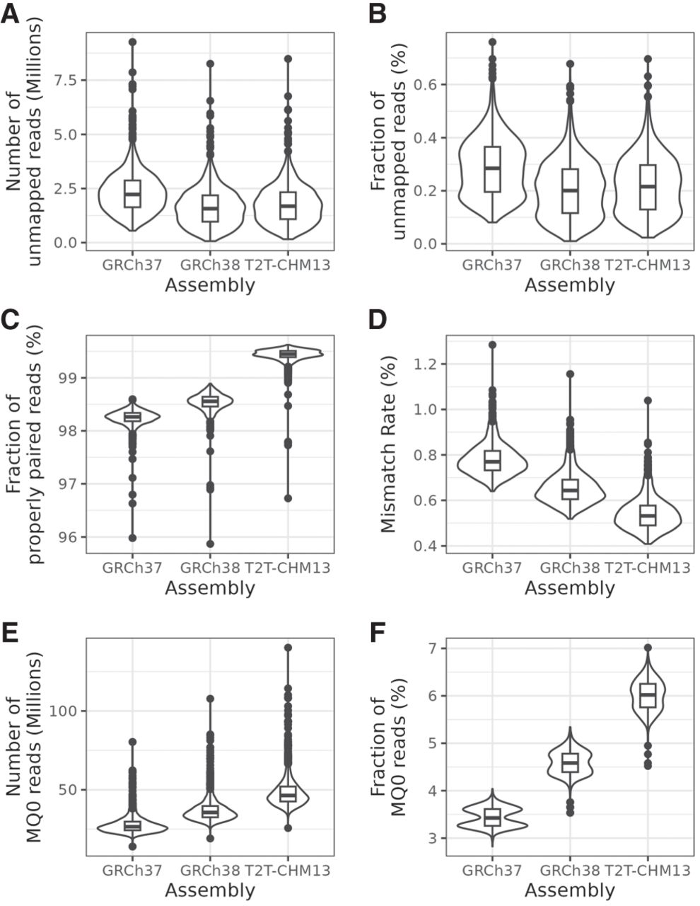 General mapping statistics for all 1000 samples. (A) Distribution of the total number of unmapped reads. (B) Percentage of unmapped reads per individual. (C) Percentage of mapped read pairs that were properly paired, that is, both mates were mapped with the expected distance and orientation. (D) Mismatch rate, that is, the fraction of mapped bases that did not match the reference. (E) Number of mappings with quality 0, that is, not mapping uniquely. (F) Percentage of mappings that had quality 0. MQ0 = mapping quality 0.