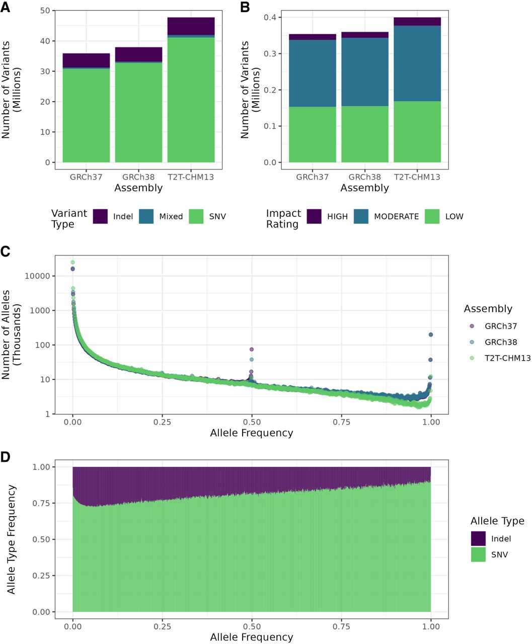 Summaries of variant characteristics from the whole cohort. (A) Comparison of overall variant counts, separated by variant type (SNV, indel, or mixed, i.e., both) between variant calls from the different assemblies. (B) Overall numbers of variants by predicted impact in the whole call set as determined by SnpEff for each assembly. Variants with impact rating MODIFIER were excluded. (C) Distribution of allele frequencies in the three assemblies. (D) Fraction of each variant type by allele frequency using T2T-CHM13. Frequencies were rounded to the closest multiple of 0.001 (1/1000).