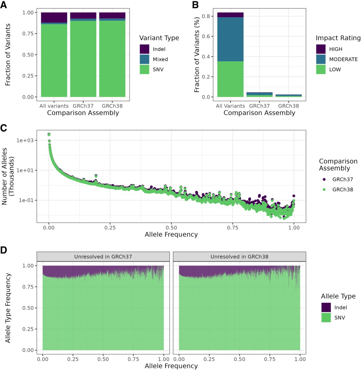 Summaries of variant characteristics from the whole cohort, restricted to newly resolved regions. (A) Fraction of variants by type in the novel regions in the T2T-CHM13 assembly that were unresolved in the reference as shown on the x-axis and the whole genome. (B) Fractions of variants by predicted impact in the whole call set as determined by SnpEff in previously unresolved regions and the whole genome. Variants with impact rating MODIFIER were excluded. (C) Distribution of allele frequencies for T2T-CHM13 specific variants mapped to regions not resolved in the two previous assemblies. (D) Fraction of each variant type by allele frequency. Frequencies were rounded to the closest multiple of 0.001 (1/1000).