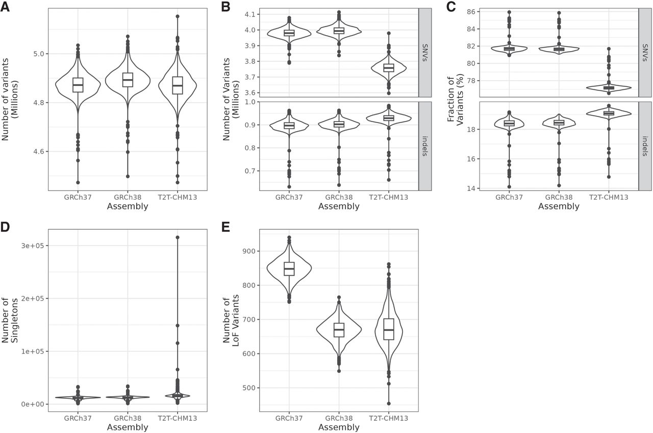 Summaries of several per-individual variant call statistics. Statistics included only variants passing filters. (A) Number of overall variants. (B) Number of SNVs and indels. (C) Fraction of SNVs and indels of called variants. (D) Number of singletons. (E) Number of LoF variants.
