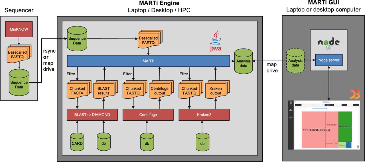 MARTi software architecture. MARTi consists of two main components: the MARTi Engine, a Java backend that performs the analysis of the sequencing data; and the MARTi GUI, a browser-based graphical user interface for visualizing, exploring, and comparing results.