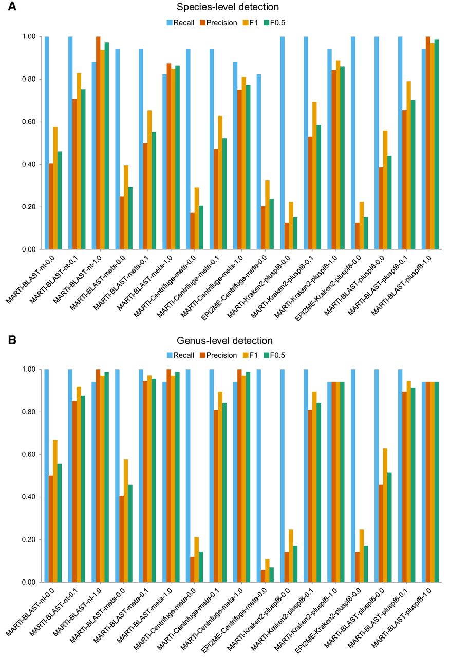 Taxa detection metrics (recall, precision, F1, and F0.5) for different pipelines using simulated reads (read length N50 ∼3.6 kb) from a small mock microbial community. (A) Species-level detection metrics. (B) Genus-level detection metrics.