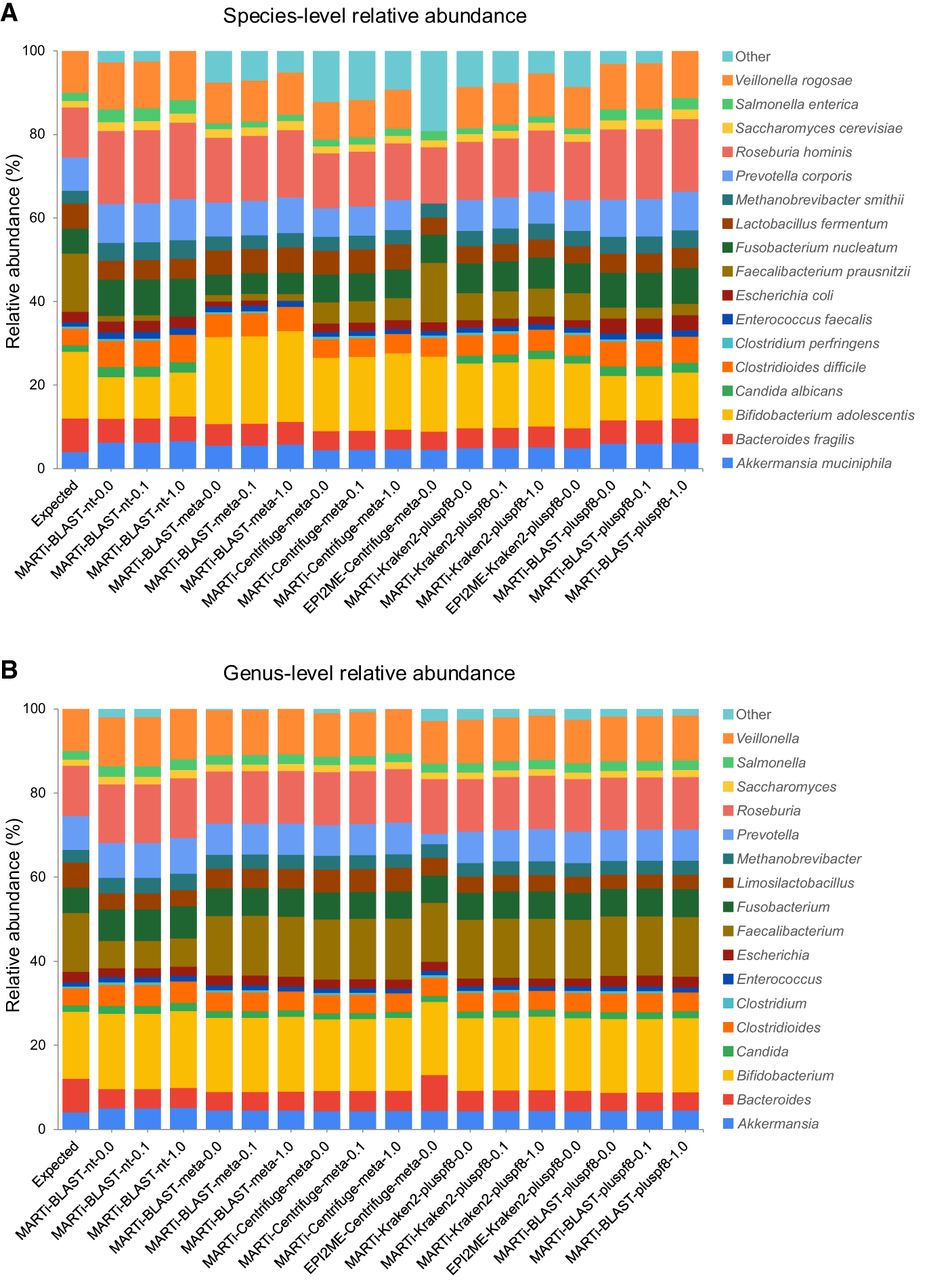 Relative abundance estimates for different classification pipelines using simulated reads from a small mock microbial community at (A) species-level, and (B) genus-level. The first bar represents the expected abundances of each taxon in the mix based on read counts. False-positive classifications are grouped into “Other.”